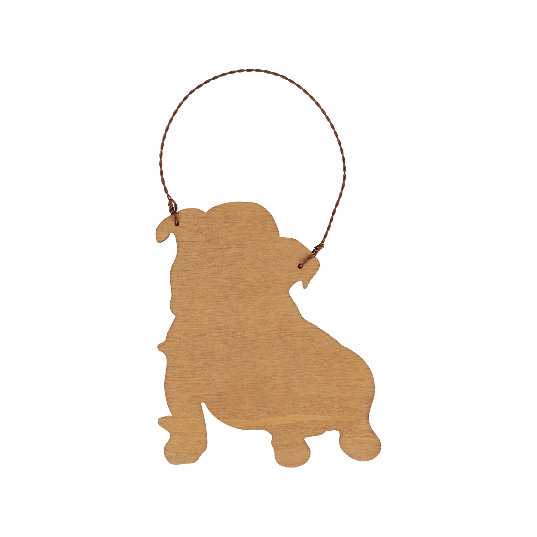 Add festive cheer with the Bulldog Christmas Lights Ornament from our Christmas Collection. Crafted from wood and inspired by original burlap artwork, it features a playful bulldog wearing a Santa hat with Christmas lights and distressed details. Ready to hang with the attached twisted wire, this ornament is a fun holiday gift and a charming addition to any Christmas tree.