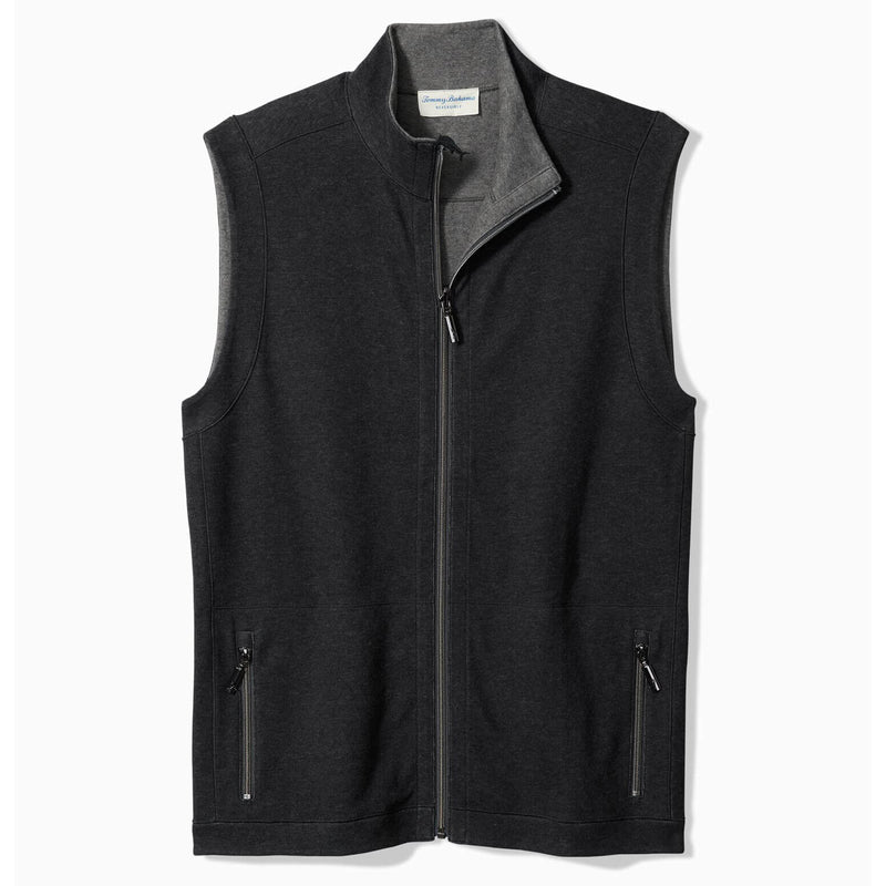 Coolside Full-Zip Vest in Black by Tommy Bahama blends performance and polish for the perfect men’s layering piece. Crafted with moisture-wicking fabric and a UPF-rated finish, this lightweight vest offers exceptional softness, mobility, and comfort. The unique two-toned texture stitchwork and ribbed trim details add refined style, while the two-way zip front makes it ideal for fall fashion and effortless transitions between seasons.