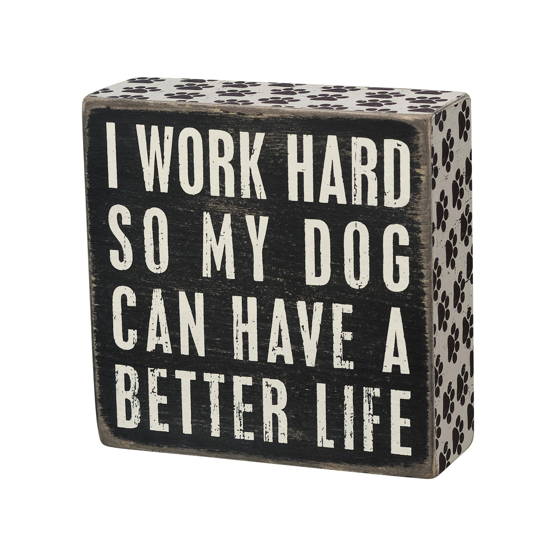 Celebrate your love for dogs with the Dog Better Life Box Sign. Crafted from wood in classic black and white, it features the distressed sentiment, “I Work Hard So My Dog Can Have A Better Life,” accented with charming paw print trim designs. Designed to hang or free-stand, the Dog Better Life Box Sign is a perfect pet-themed décor accent.