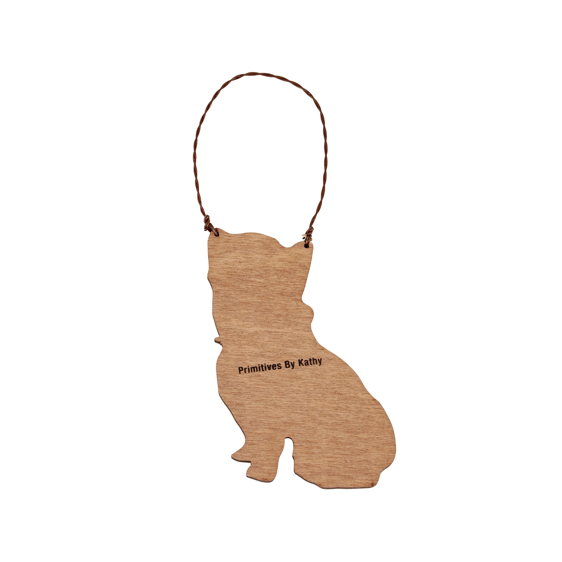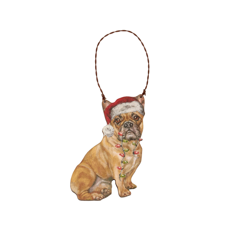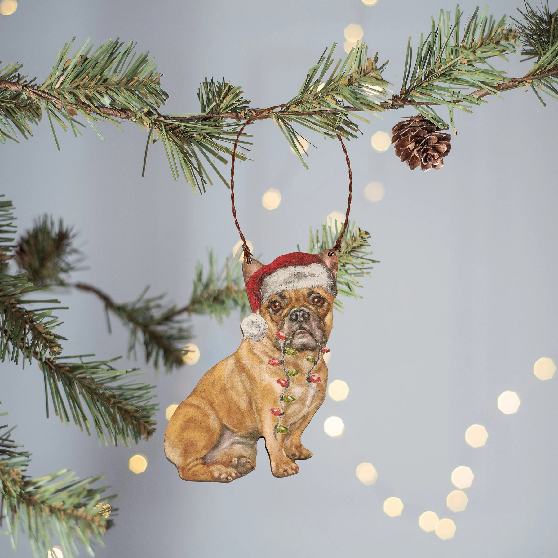 Add festive fun with the Frenchie Christmas Lights Ornament from our Christmas Collection. Crafted from wood and inspired by original burlap artwork, it features an adorable French Bulldog with Christmas lights, complete with charming textured and distressed details. Ready to hang, this ornament is a delightful holiday gift and a cheerful addition to any Christmas tree.