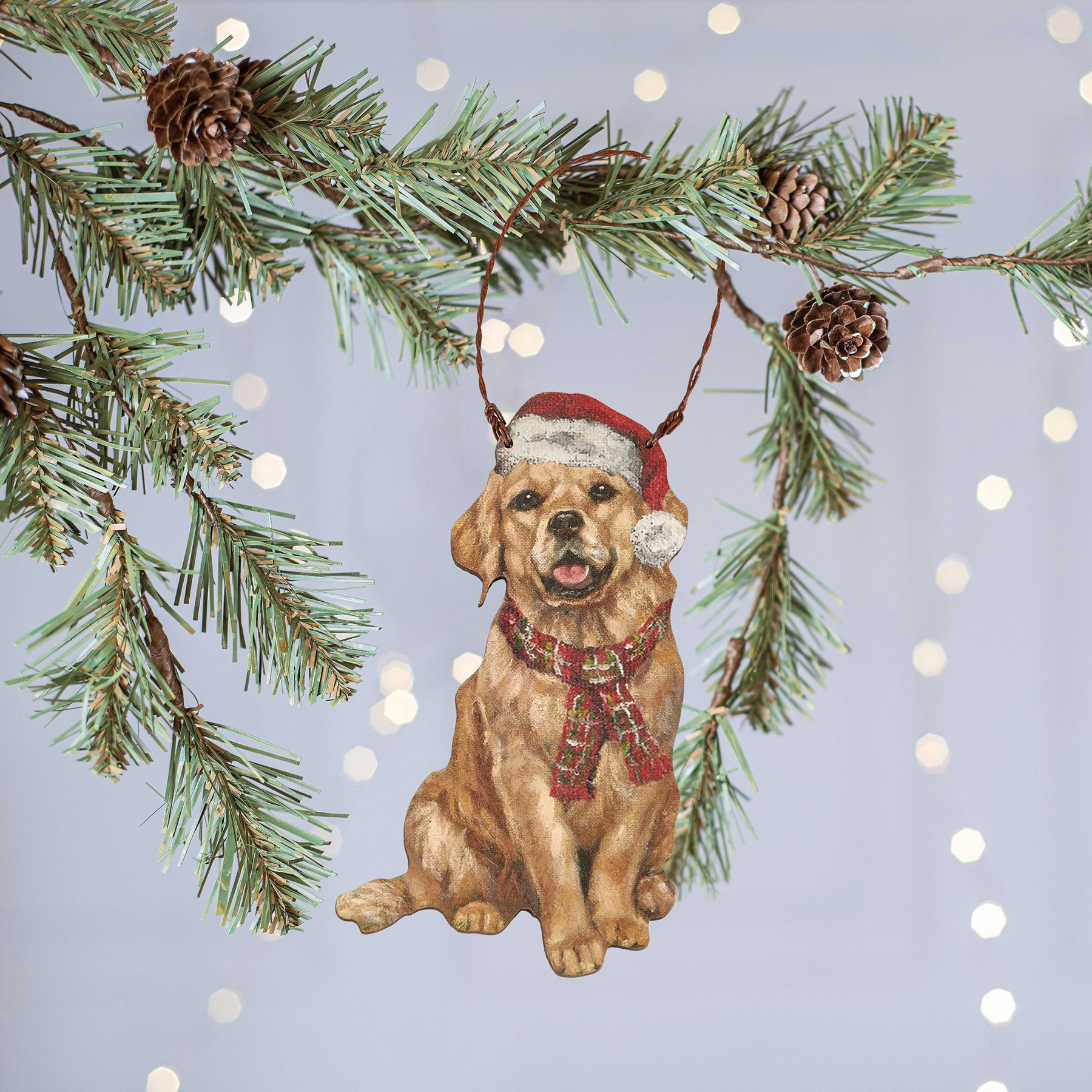 Spread holiday cheer with the Golden Retriever Santa Ornament from our Christmas Collection. Crafted from wood and inspired by original burlap artwork, it features a lovable Golden Retriever wearing a Santa hat, with charming textured and distressed details. Ready to hang, this ornament is a festive holiday gift and a playful addition to any Christmas tree.