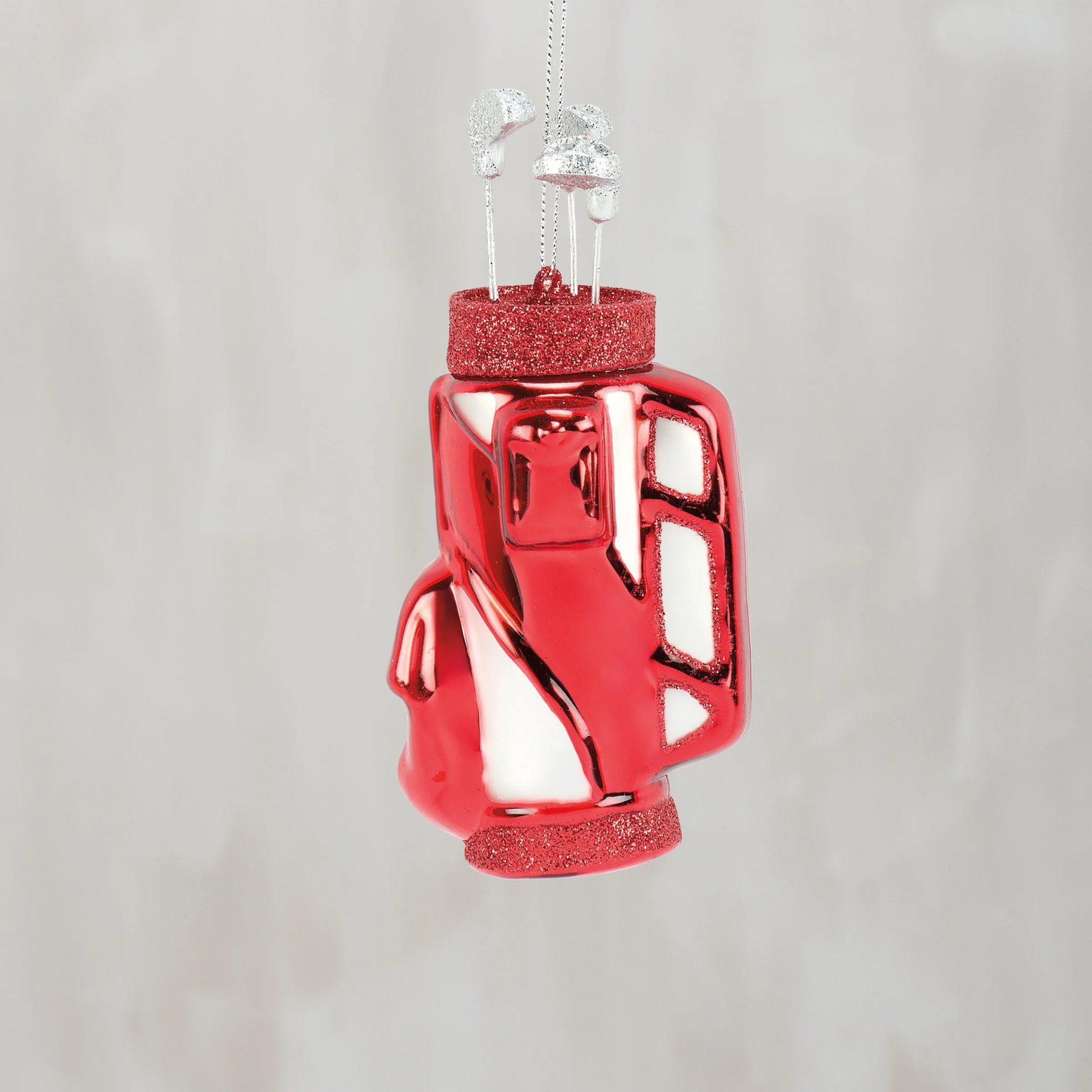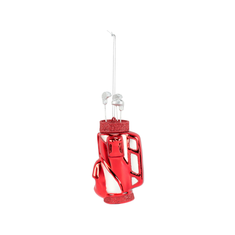 Celebrate the holidays with the Golf Bag Glass Ornament from our Christmas Collection. Crafted from glass and featuring a detailed golf bag design with sparkling glitter accents, this ornament adds a playful, festive touch to any tree. Ready to hang with the included top loop, the Golf Bag Glass Ornament is a perfect holiday gift for golf enthusiasts.