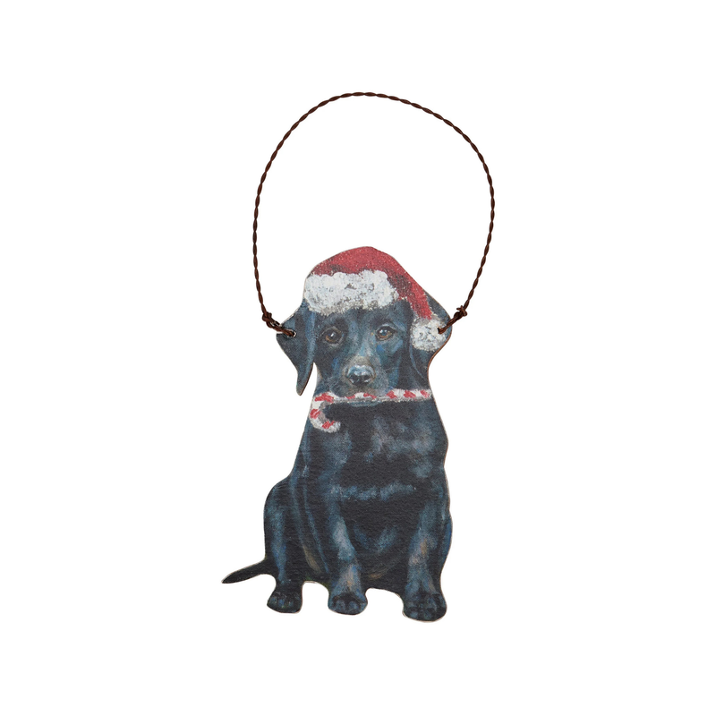 Add holiday cheer with the Lab Black Candy Cane Ornament from our Christmas Collection. Crafted from wood and inspired by original burlap artwork, it features a charming black Labrador wearing a Christmas wreath and holding a candy cane in its mouth, with distressed details and coordinating red sides. Ready to hang, this ornament is a fun holiday gift and a festive addition to any Christmas tree.