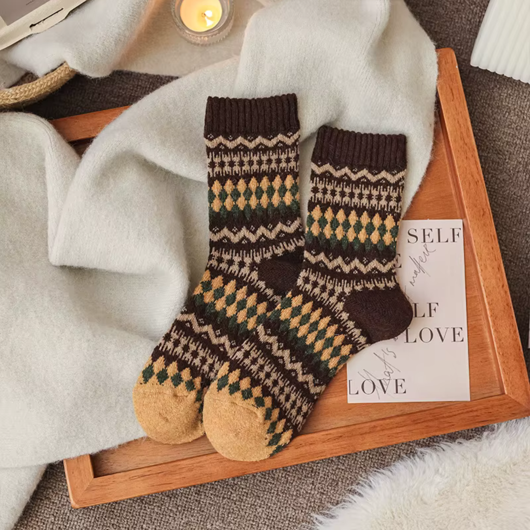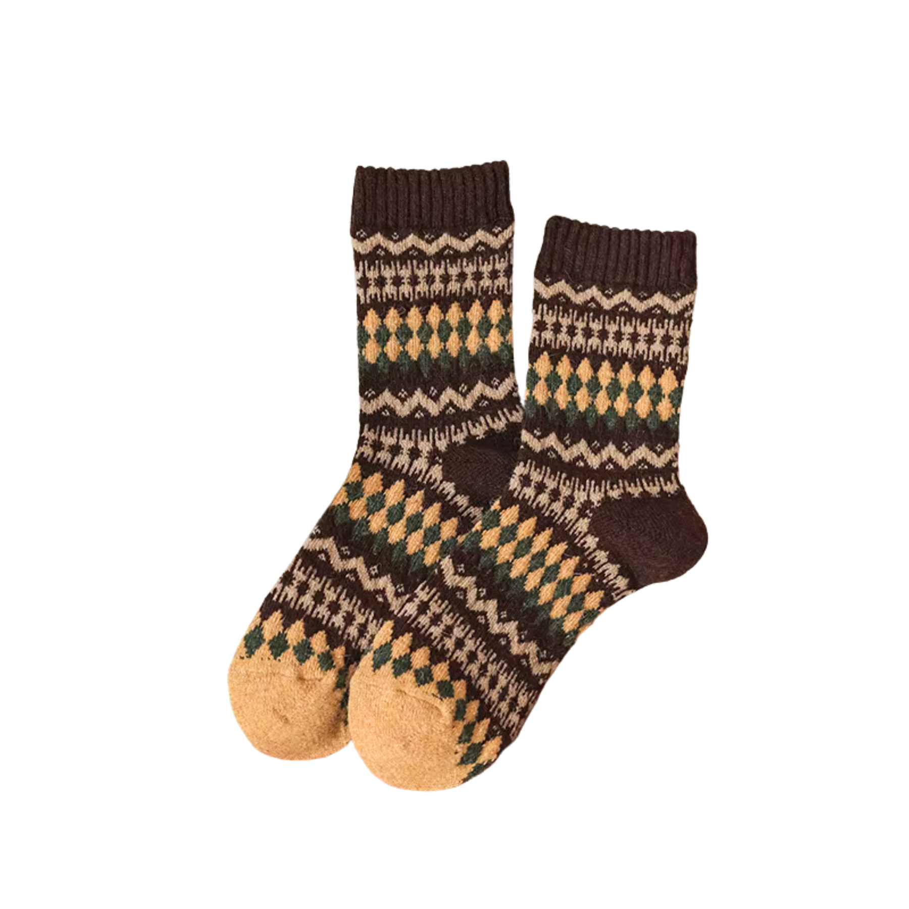 Lily Cabin Socks in Brown by Madison’s Niche offer a perfect blend of comfort and classic style. Featuring a refined geometric Fair Isle pattern with chevron, diamond, and rhombus motifs, these women’s socks provide warmth while adding a touch of elegance to any outfit. Ideal for cozying up at home or enhancing casual ensembles, the Lily Cabin Socks are a sophisticated accessory for the colder season.