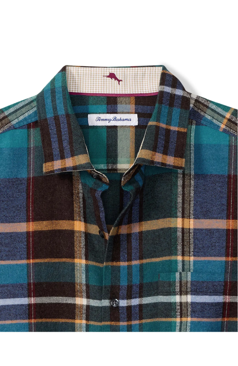 Palonia Plaid Flannel in Ebony by Tommy Bahama brings timeless men’s style and comfort together in one versatile layer. Crafted from brushed all-cotton flannel for superior softness, this plaid shirt features a classic fit, a stay-tucked lower hem, and eye-catching contrast insets at the collar and cuffs for a subtle pop of color. Perfect for fall fashion and relaxed weekends, this Tommy Bahama flannel pairs effortlessly with jeans or chinos for a polished yet laid-back look.