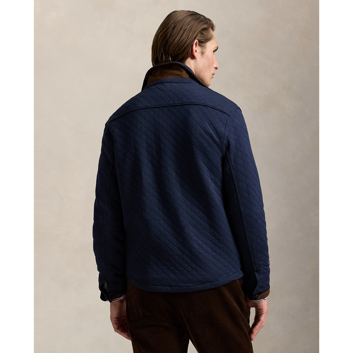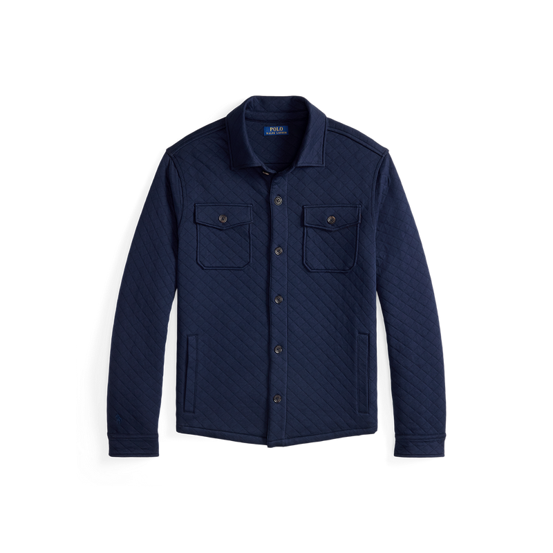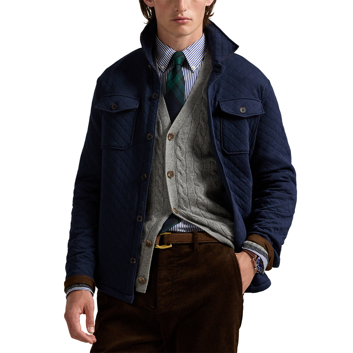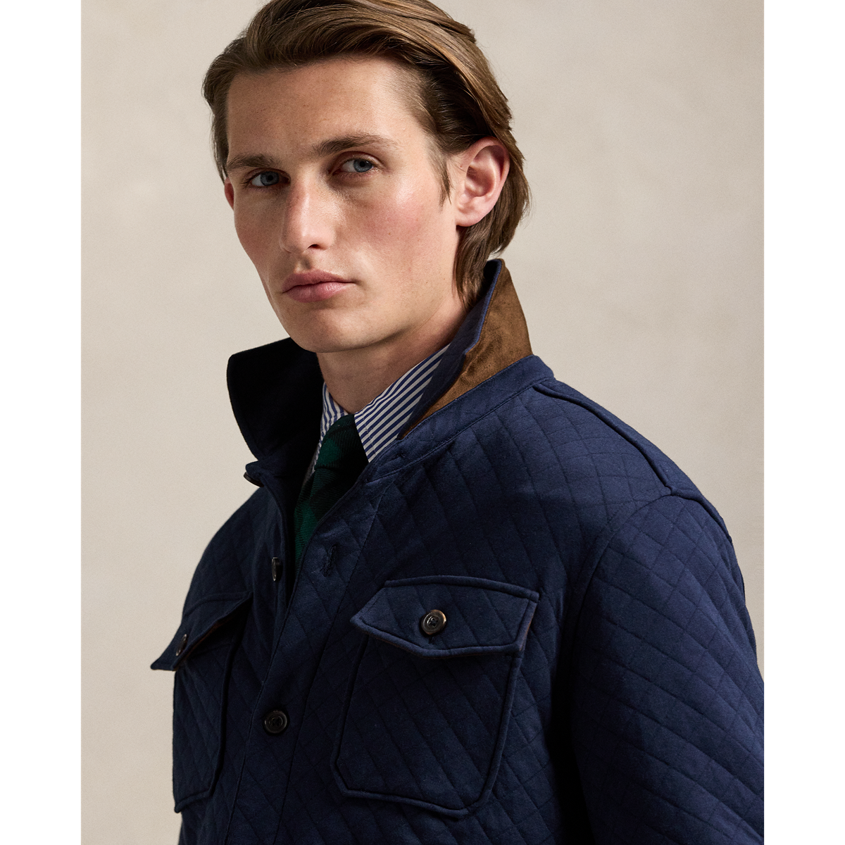 The Quilted Shirt Jacket in Navy by Ralph Lauren blends rugged function with refined style for essential men’s fall layering. Designed with a micro-diamond quilt pattern, this shirt jacket is crafted from ultra-soft double-knit jersey, insulated for warmth, and finished with rich faux-suede trim—a perfect balance of comfort, texture, and classic Polo Ralph Lauren detail.