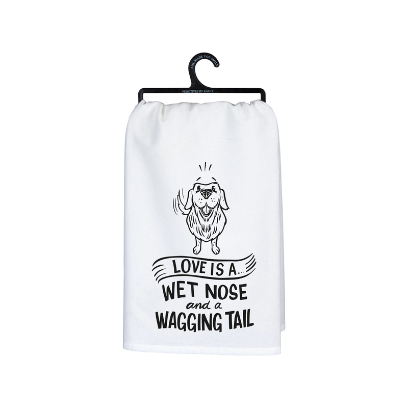 Add charm to your kitchen with the Wagging Tail Towel from our Pet Collection. Made from soft, durable cotton, this black and white kitchen towel features a hand-illustrated dog and the heartwarming sentiment, “Love Is A Wet Nose And A Wagging Tail.” Machine-washable for easy care and packaged on a black hanger for convenient display, the Wagging Tail Towel is a fun and functional pet-themed kitchen accessory for everyday use.
