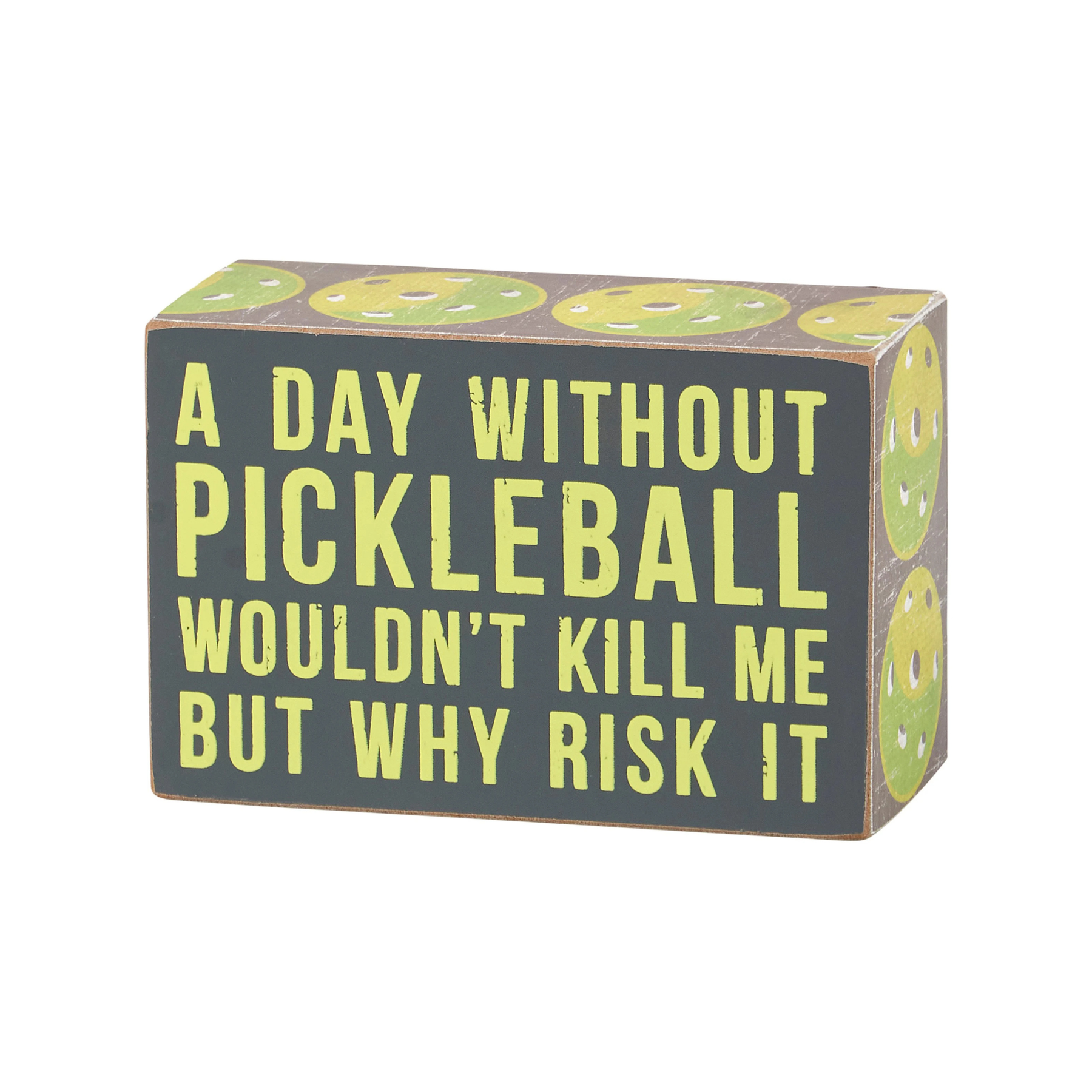 Celebrate your love for pickleball with the Without Pickleball Box Sign from our Sports Collection. Crafted from wood in a classic box sign style, it features the humorous sentiment, “A Day Without Pickleball Wouldn’t Kill Me But Why Risk It,” with coordinating gray sides accented by a pickleball pattern. Designed to hang or free-stand, the Without Pickleball Box Sign is a fun pickleball-themed décor piece and a perfect gift for any enthusiast.