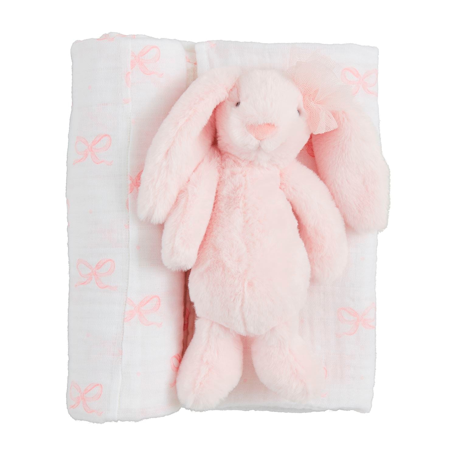 The Bow Bunny Swaddle & Rattle Set is a delightful 2-piece baby gift designed for comfort and play. The muslin swaddle blanket is soft, breathable, and cozy, perfect for wrapping newborns or as a lightweight nap blanket. Paired with it is a coordinating faux fur plush bunny rattle, featuring an adorable bow detail, ideal for tiny hands and sensory play. This charming set is perfect for nurseries, newborn essentials, or as a thoughtful baby shower gift, combining practicality with playful design.