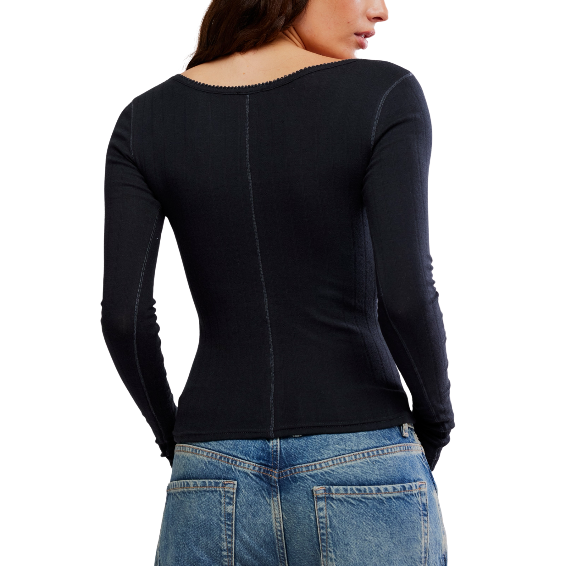 The End Game Pointelle Long Sleeve in Black by Free People is a refined everyday essential with feminine detail. Crafted from soft pointelle cotton top fabric, this fitted long sleeve shirt features a classic button-up front, delicate scalloped trim, and an elegant textured finish. Designed for comfort and versatility, this Free People long sleeve top is perfect for effortless layering or wearing on its own.