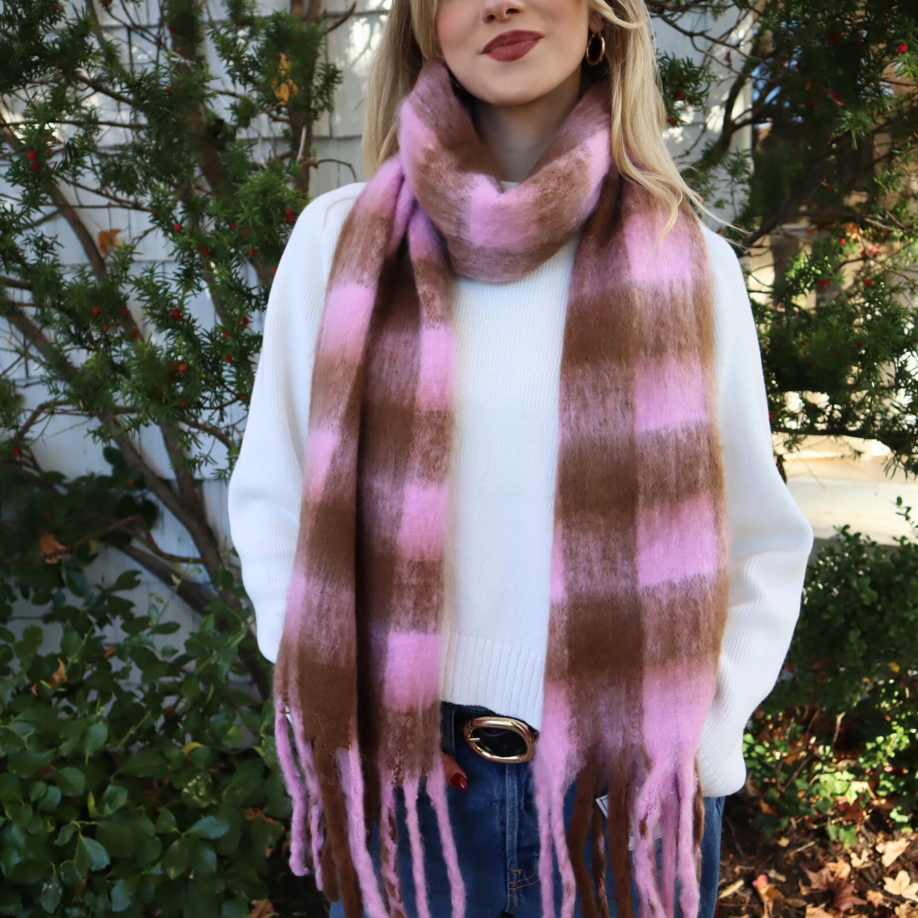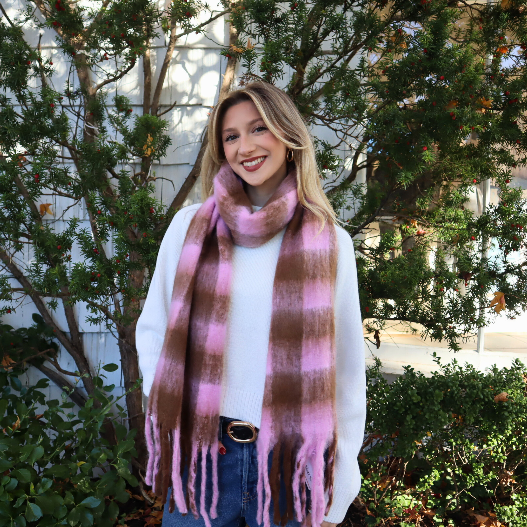 Janice Plaid Scarf in Pink by Madison’s Niche is a perfect mix of cozy comfort and effortless style. Its soft, delicate texture and classic plaid pattern make it a versatile winter scarf that keeps you warm while looking polished. Ideal as a thoughtful holiday gift or a chic everyday accessory, the Janice Plaid Scarf adds a touch of timeless elegance to any outfit.