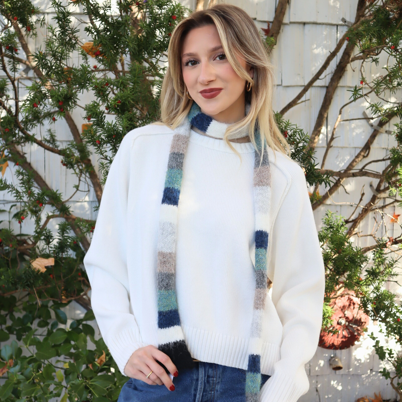 Kelsy Striped Scarf in Grey by Madison’s Niche offers a subtle yet stylish accent for your autumn and winter wardrobe. Made from soft, lightweight fabric, its understated rainbow stripes provide a refined pop of color while keeping the look versatile. Perfect as a chic accessory for layering or enhancing everyday outfits, the Kelsy Striped Scarf combines modern design with effortless elegance.
