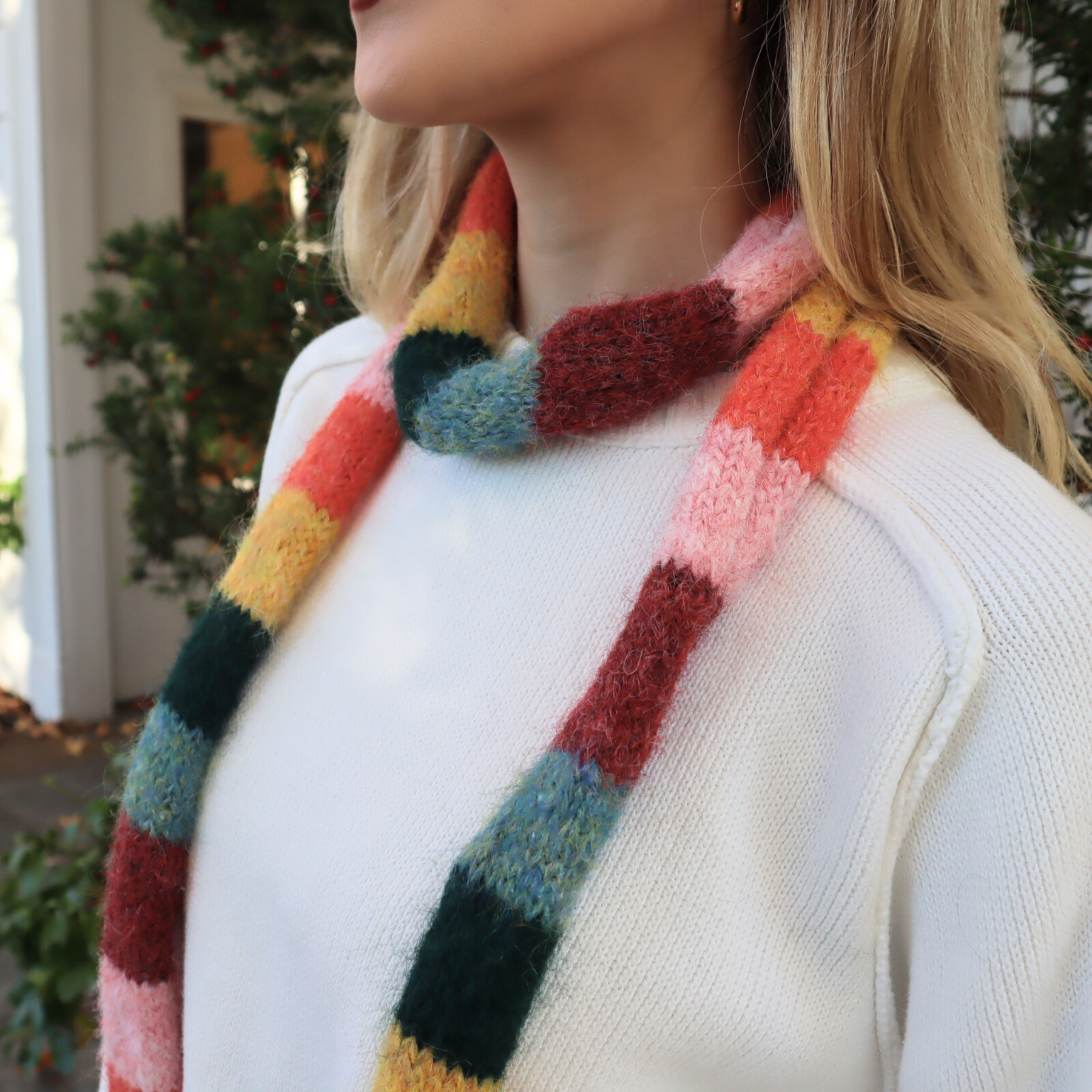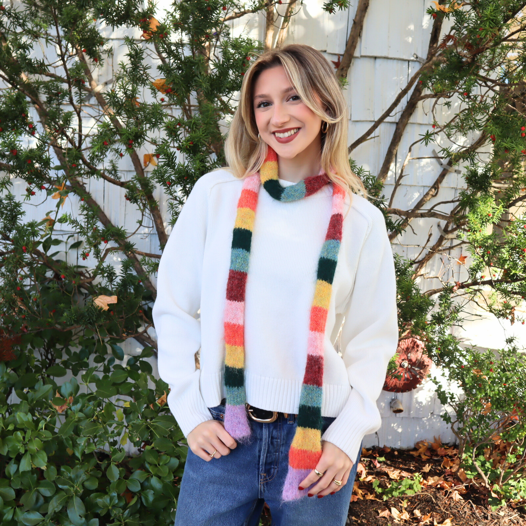Kelsy Striped Scarf in Orange by Madison’s Niche brings a warm and playful elegance to your autumn and winter wardrobe. Crafted from soft, lightweight fabric, its vibrant rainbow stripes add a pop of color while remaining versatile and easy to style. Perfect as a chic accessory for layering or brightening everyday outfits, the Kelsy Striped Scarf blends contemporary design with effortless sophistication.