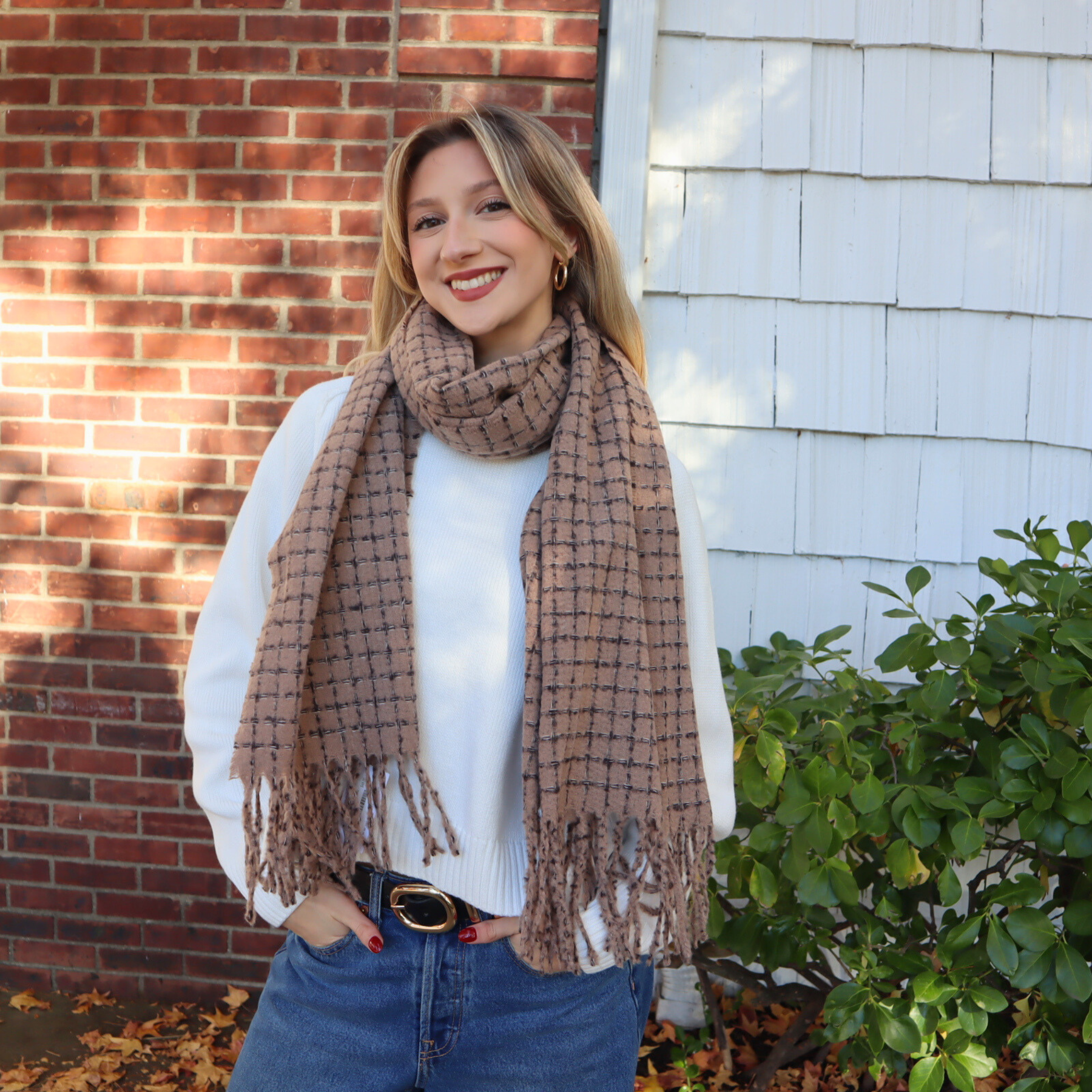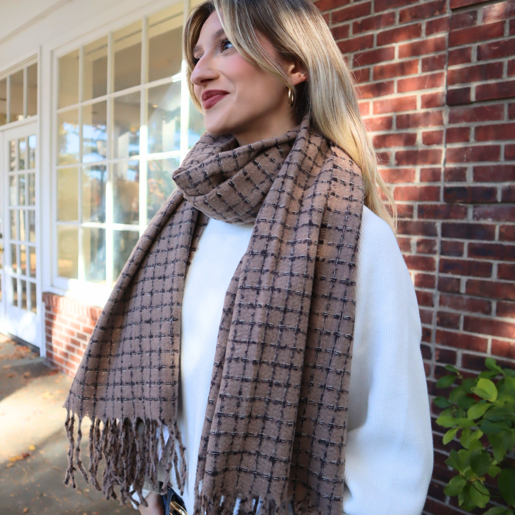 Windowpane Scarf in Brown by Madison’s Niche — a stylish blend of warmth and classic design. Featuring a windowpane pattern, this scarf adds a refined touch to any winter outfit while keeping you cozy. The rich brown hue makes it a versatile winter accessory and a thoughtful holiday 2025 gift.