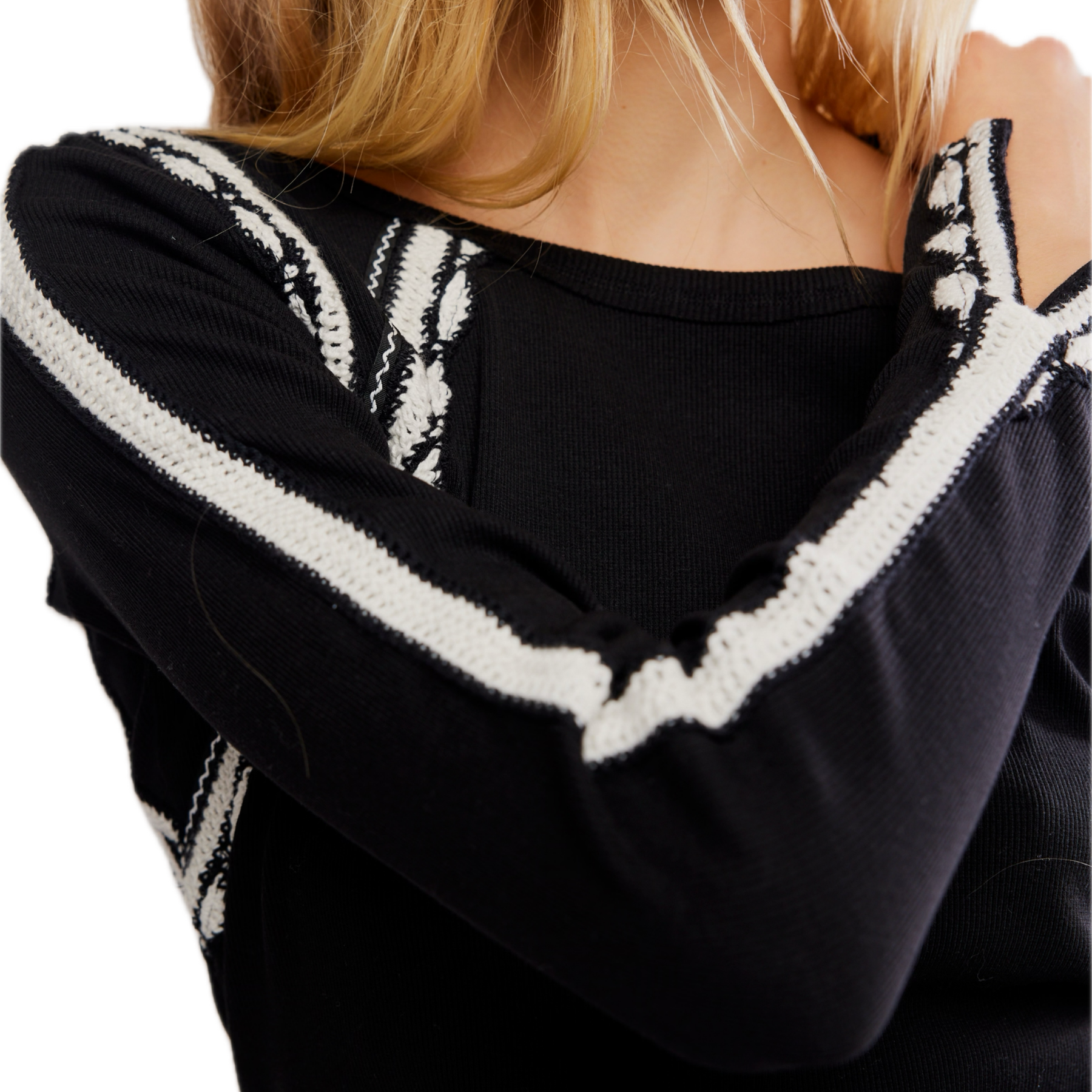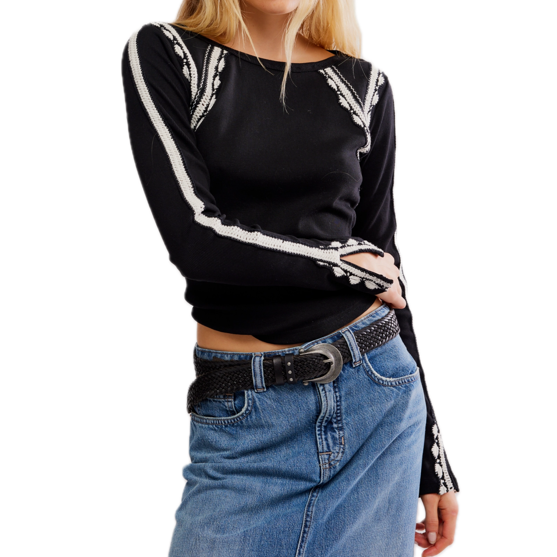 The Lost Love Long-Sleeve in Black by Free People is a timeless essential for your fall wardrobe. Featuring a soft ribbed cotton fabrication, flattering boat neckline, and delicate lace trim, this long-sleeve top blends comfort with subtle elegance. Its relaxed fit and split-hem sleeves make it perfect for pairing with your go-to denim or layering under cozy outerwear all season long.