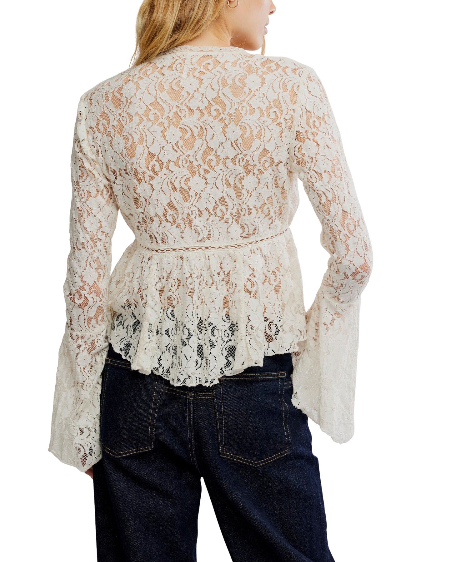 Embrace delicate romance with the Whispering Love Lace Top in Tofu by Free People. This sheer lace top features a billowy peplum silhouette, flowy bell sleeves, and ruffled details for effortless femininity. With a V-neckline and button-front closure, it’s the perfect elevated blouse for layering or standalone style.