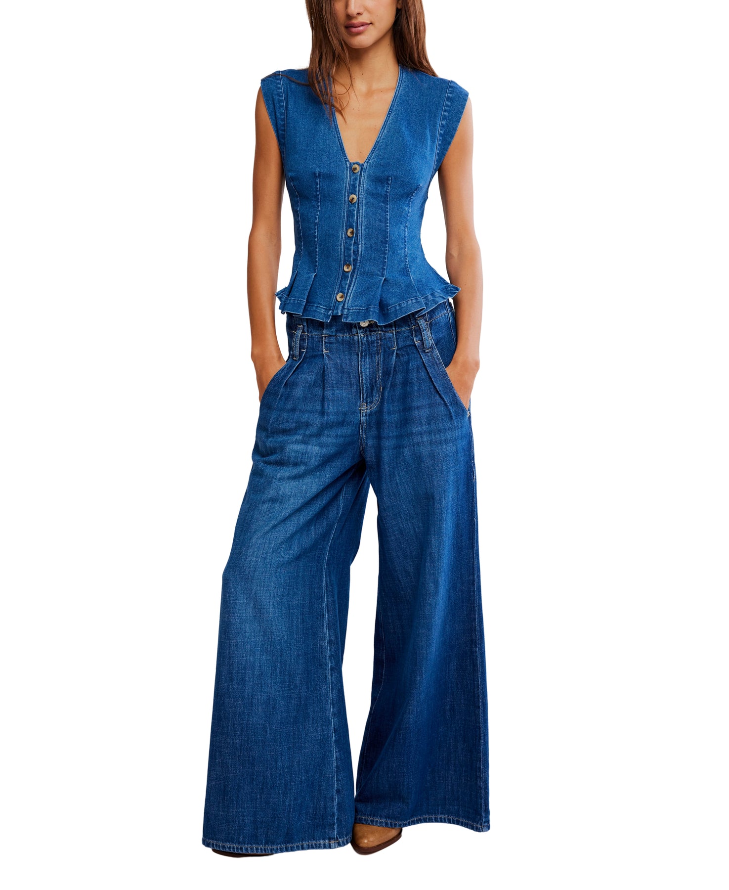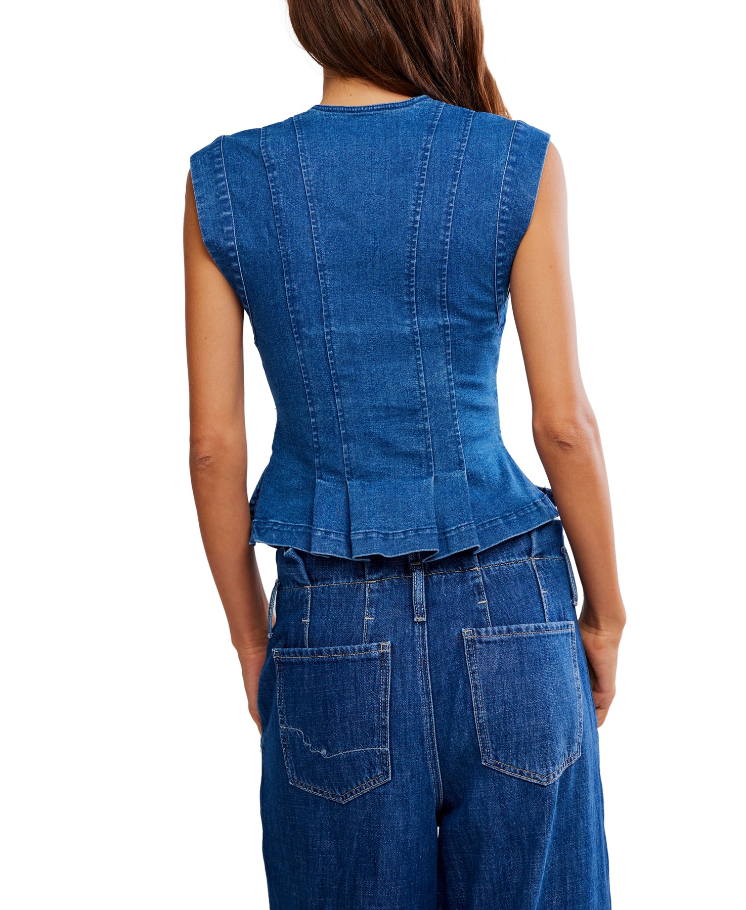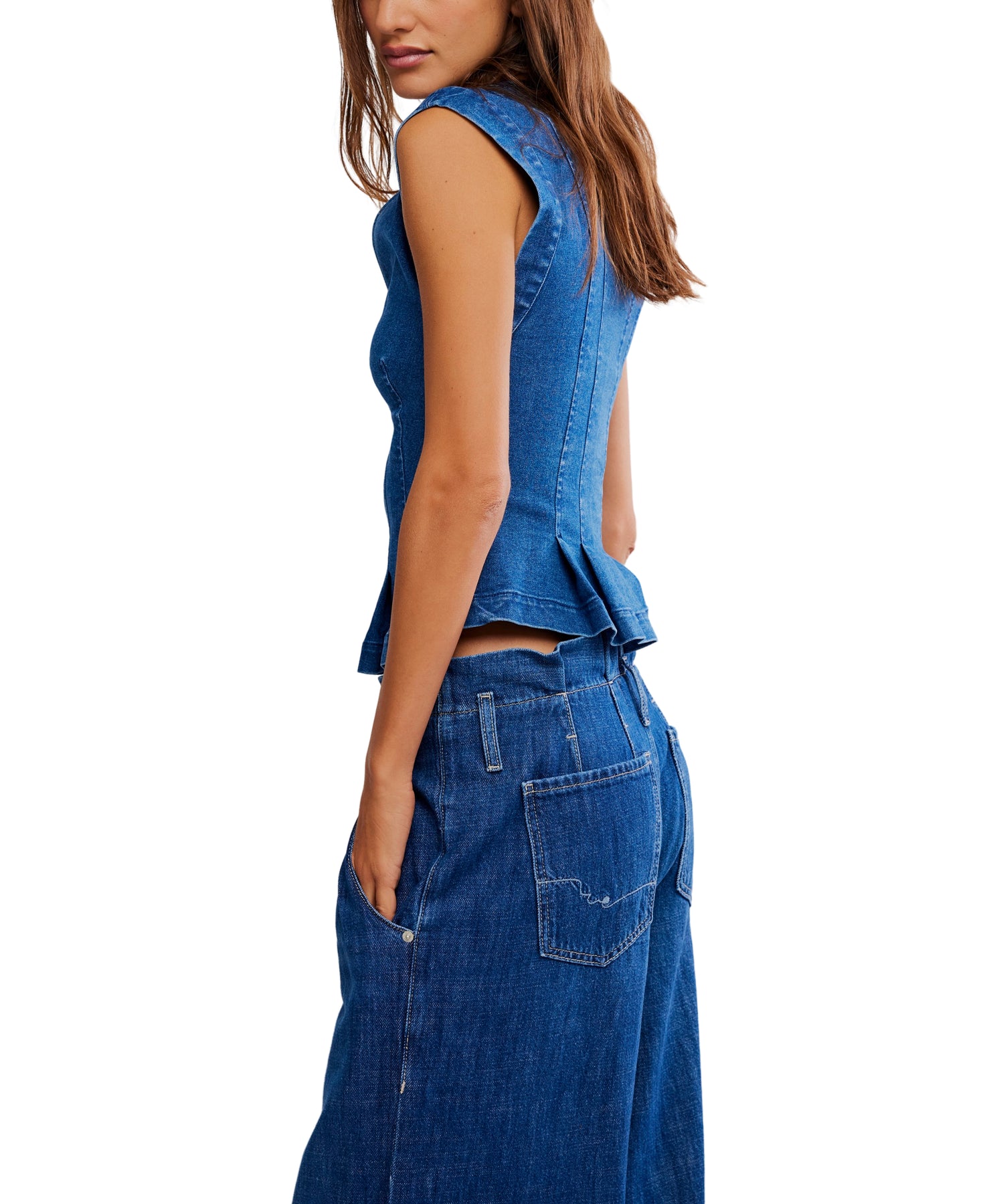 The Dylan Denim Vest in Medium Blue by Free People is a flattering, versatile essential. This denim vest top features a V-neckline, wide shoulders, capped sleeves, and a button-front design with a pleated peplum for a flared, feminine fit. Perfect for layering or styling solo, this Free People denim vest adds effortless charm to any outfit.