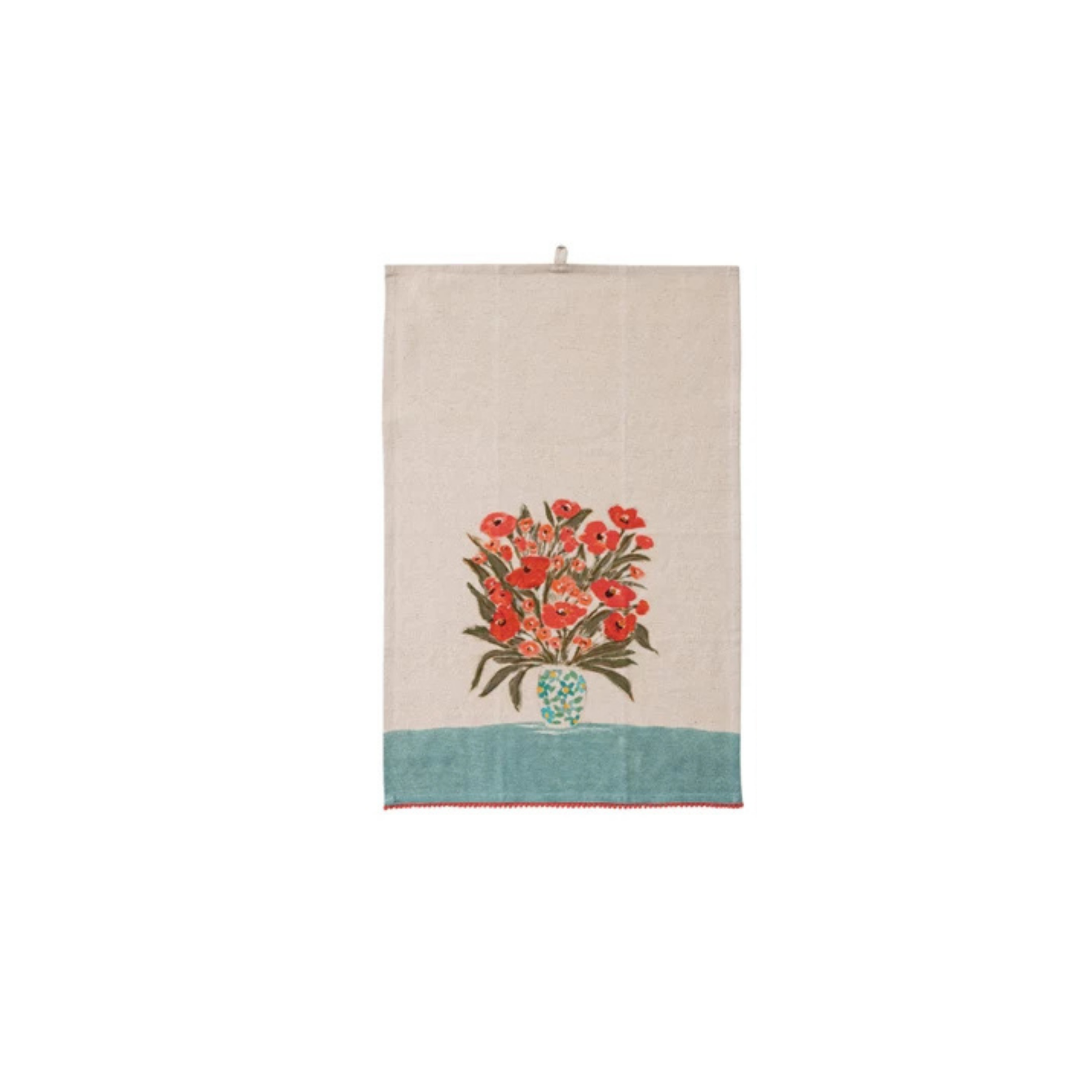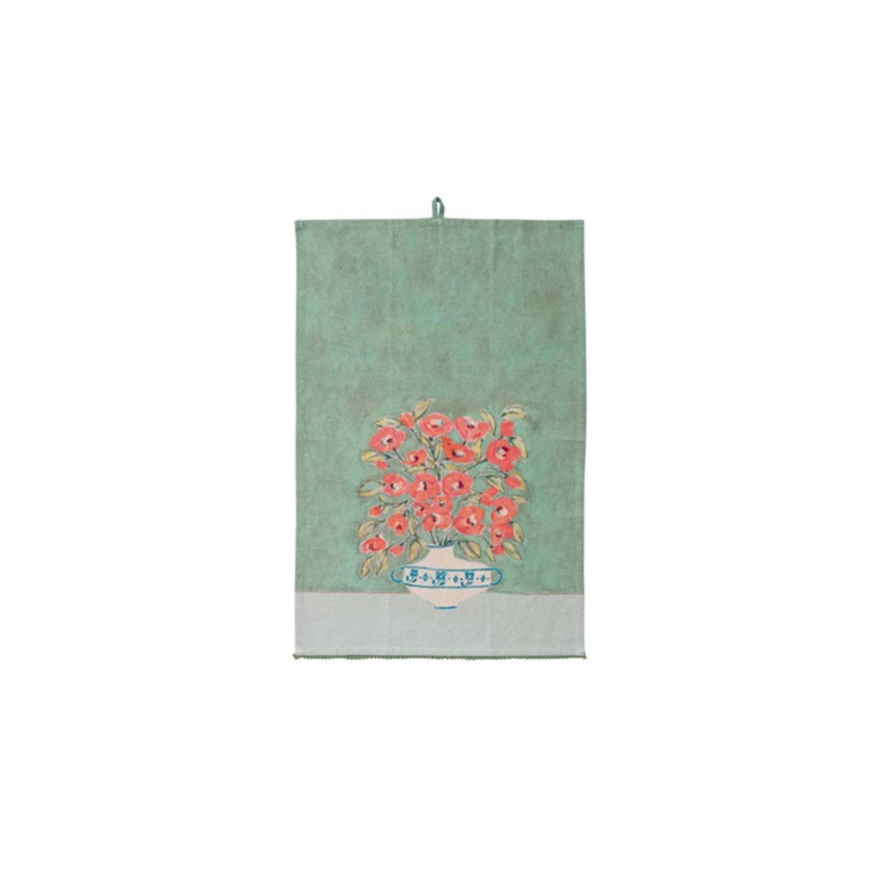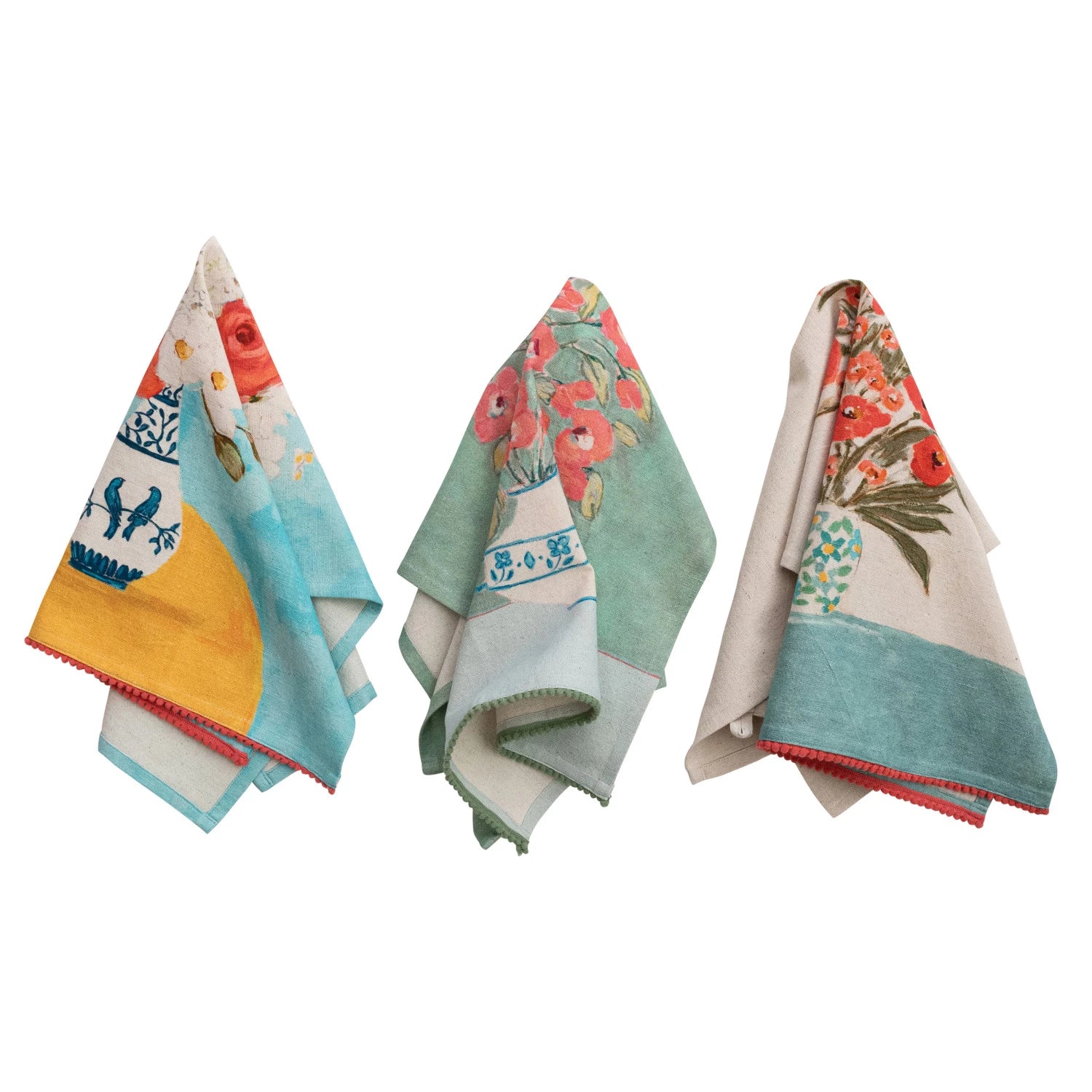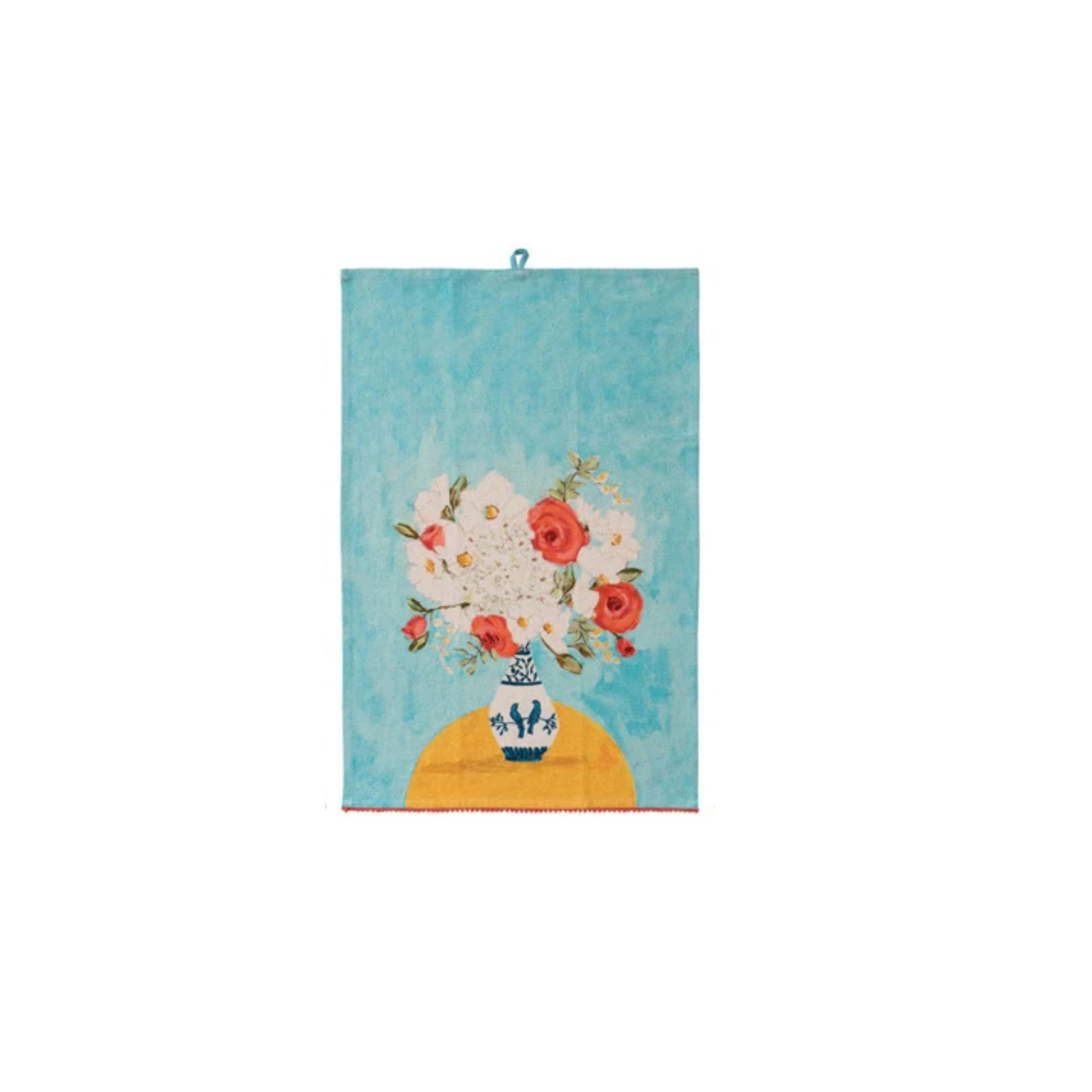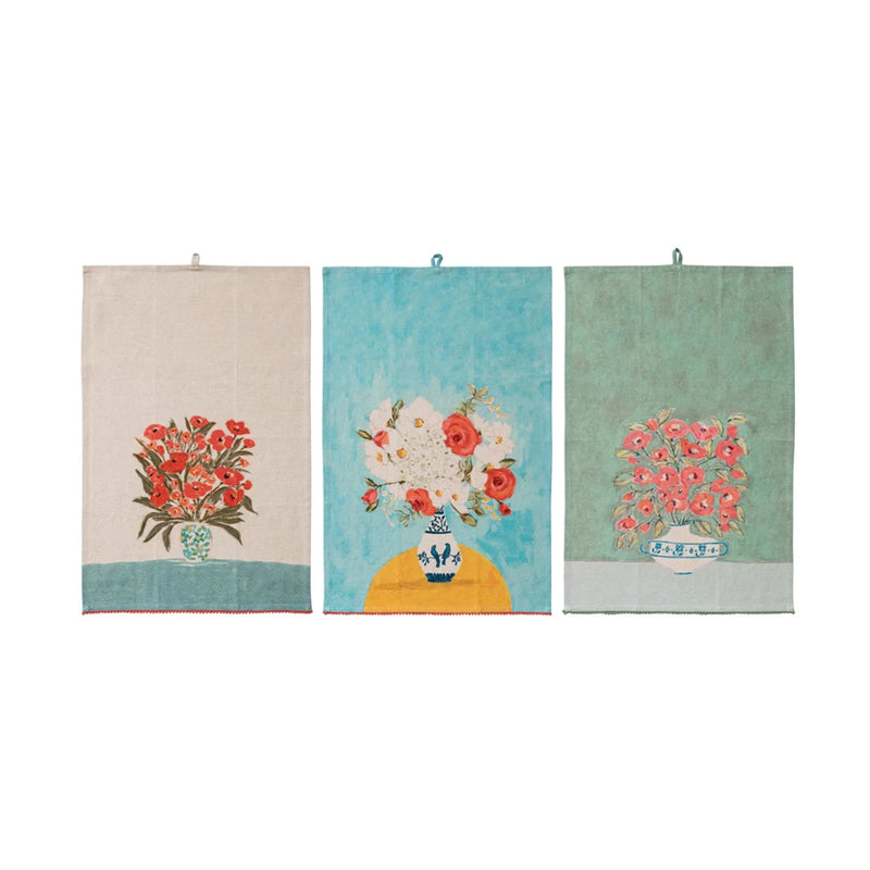 Brighten your kitchen with this charming Flowers in Vase Tea Towel. Crafted from soft cotton and linen, it features a colorful printed floral design and playful mini pom pom trim. Available in 3 styles, this kitchen towel combines everyday functionality with decorative flair, perfect for drying, display, or gifting to home cooks and tea towel lovers.