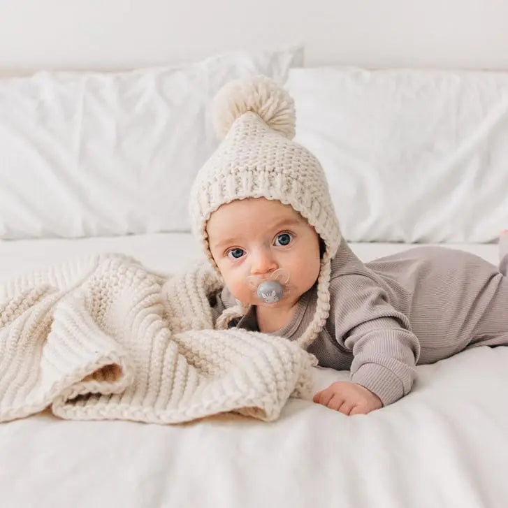 Indulge in luxury with our Garter Stitch Knit Bonnet in Natural. Handcrafted with exquisite Icelandic yarn, this cozy bonnet not only keeps your baby warm, but also adds a touch of elegance to any outfit. The furry pom and chin tie make it a perfect photo prop and gift.