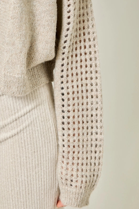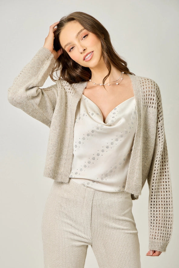 Metallic Sweater Cardigan in Champagne featuring shimmering lurex threading throughout for a subtle, elegant sparkle that elevates any look. Designed with an easy open-front silhouette, this versatile layer drapes beautifully and pairs effortlessly with both casual and dressy outfits. The long sleeves offer cozy coverage, while the ridged eyelet stitching along the sleeves and shoulders adds refined texture and a touch of intricate detail. Perfect for holiday gatherings, special occasions, or simply adding a hint of shine to your everyday style.