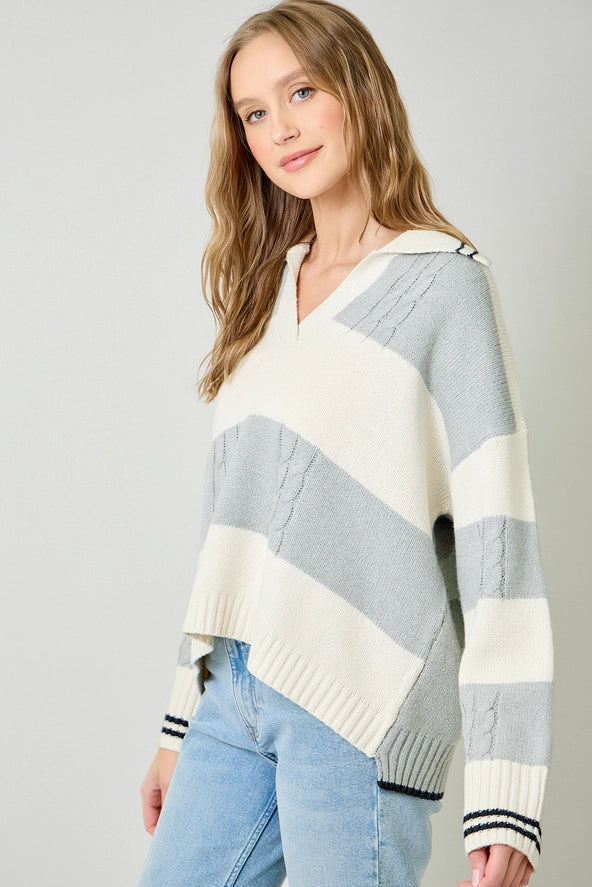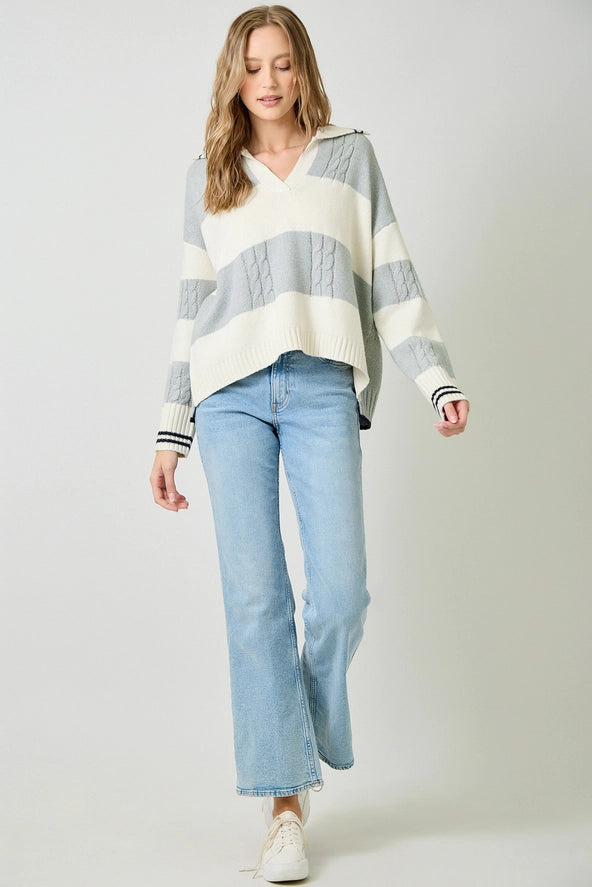 The V-Neck Multistripe Sweater brings fresh, modern texture to your knitwear lineup with its bold striped collar, soft ribbed and cable-knit design, and unexpected color-blocked back. Crafted with a flattering V-neckline and an easy hi-lo hem, this versatile women’s striped sweater blends classic detailing with a contemporary twist—perfect for everyday styling, layered looks, or adding a pop of personality to your cold-weather outfits.