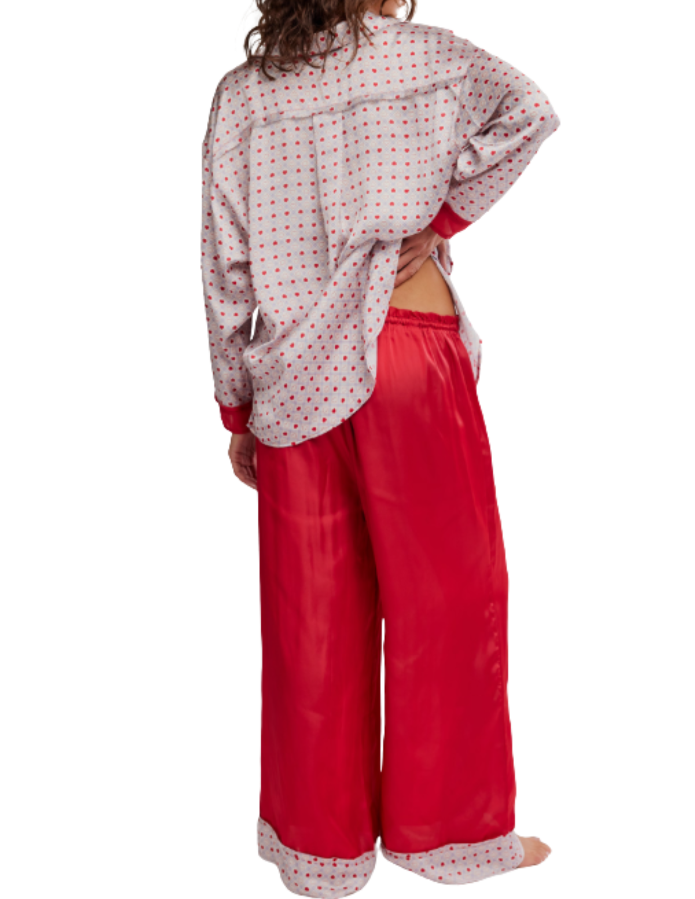 Lounge in effortless comfort with the Dreamy Days Pajama Set in Heart Combo by Free People, a relaxed and cozy women’s pajama set crafted from lightweight, breathable fabric with a soft, allover print. Designed with a slouchy, oversized fit, it features a classic button-front long-sleeve top and wide-leg bottoms with an elastic waistband and adjustable drawstring for all-day ease. This charming sleep set is perfect for slow mornings, cozy nights, or gifting someone special.