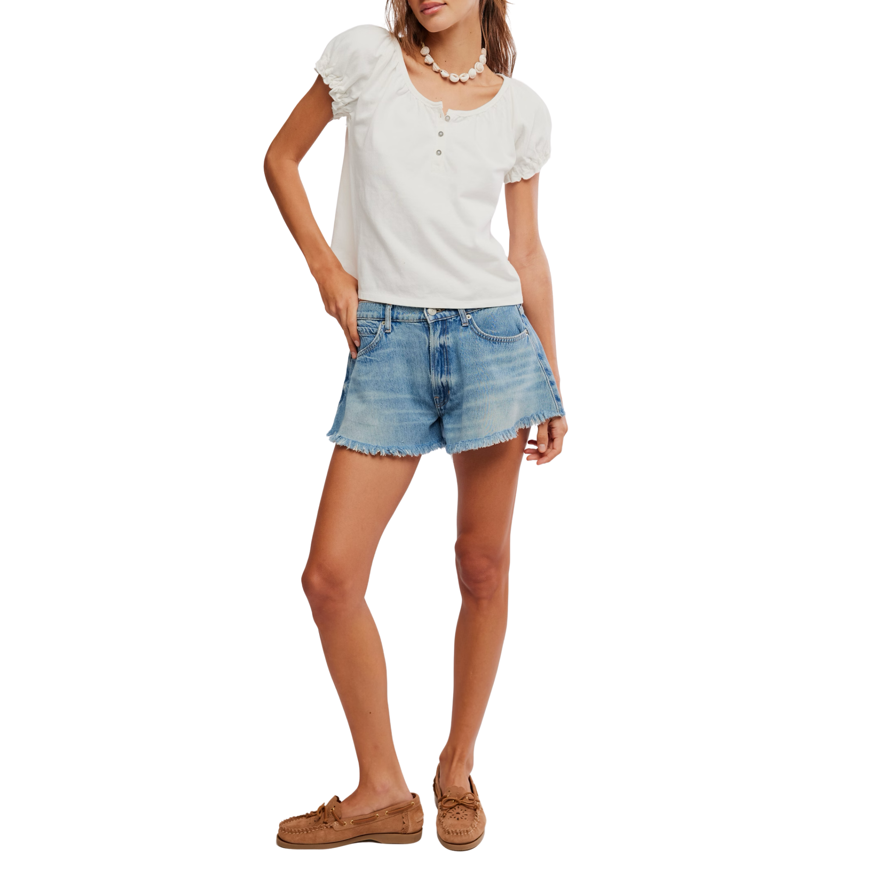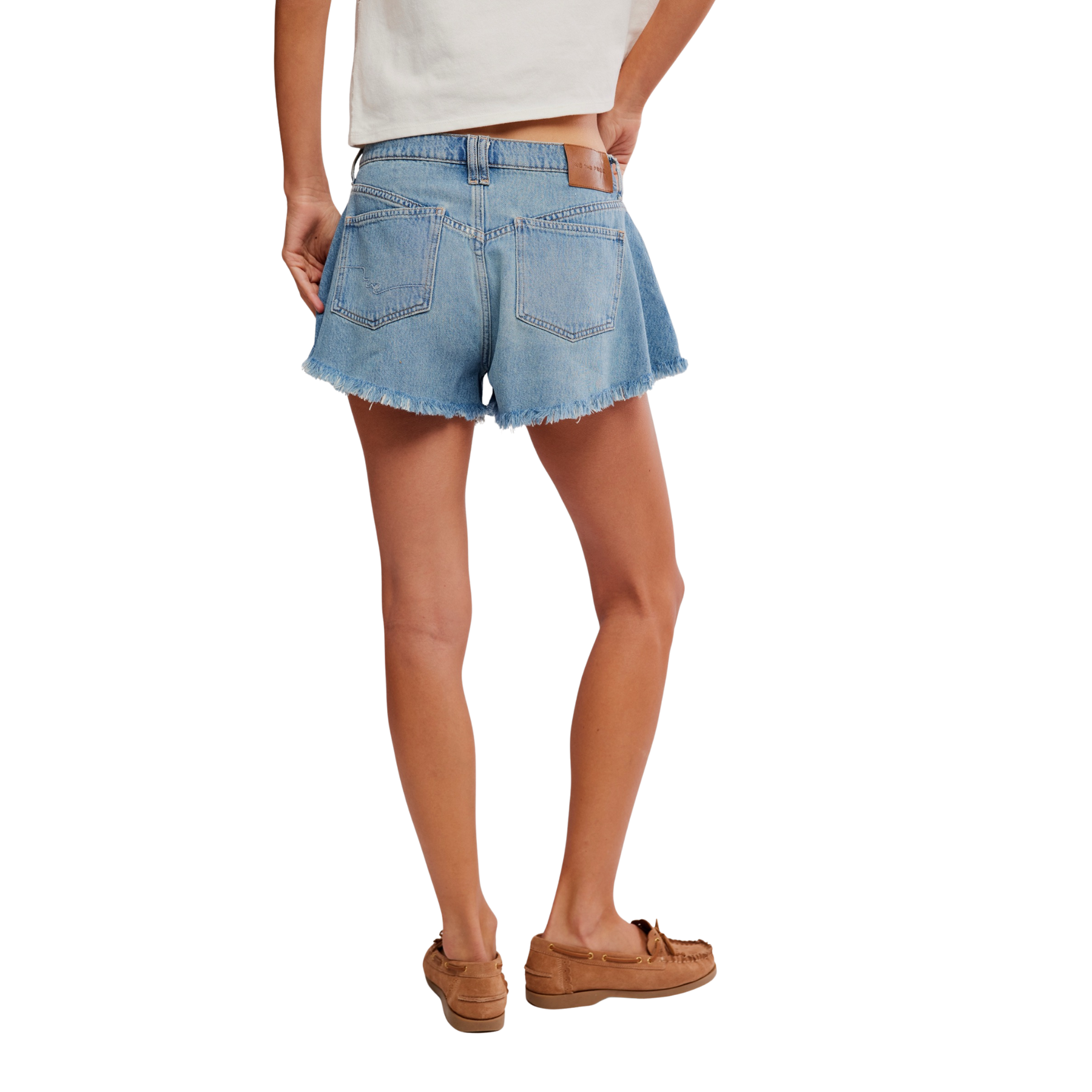 Refresh your denim lineup with the Sparks Fly Short in Meadowbrook by Free People — a modern take on women’s mid-rise denim shorts designed with subtle movement and flattering shape. Featuring an A-line, relaxed mini silhouette, this authentic rigid denim short offers a perfectly lived-in feel. Complete with a classic five-pocket design, zip fly, and raw hem, these A-line mini denim shorts deliver effortless edge for everyday warm-weather styling.