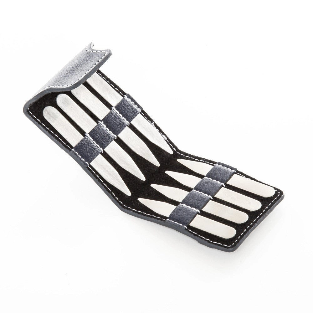 Elevate your style with our Black Travel Collar Stay Set. The sleek case is perfect for the sophisticated traveler, ensuring your collars stay crisp and pressed no matter the shirt size. Make a lasting impression with this essential accessory.