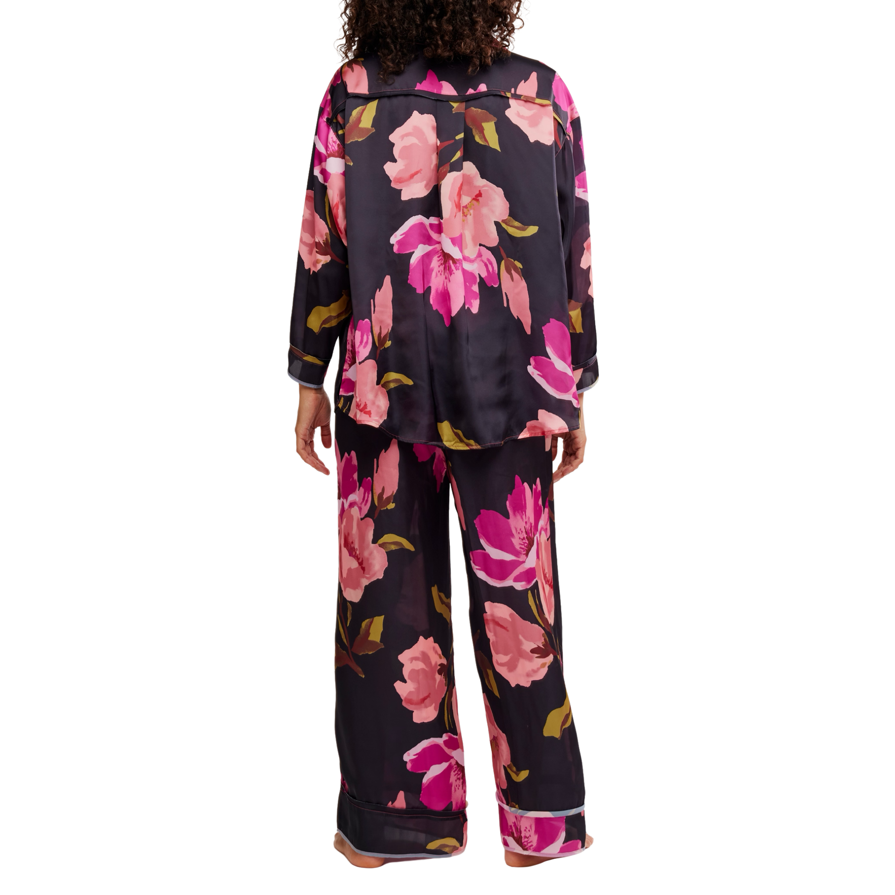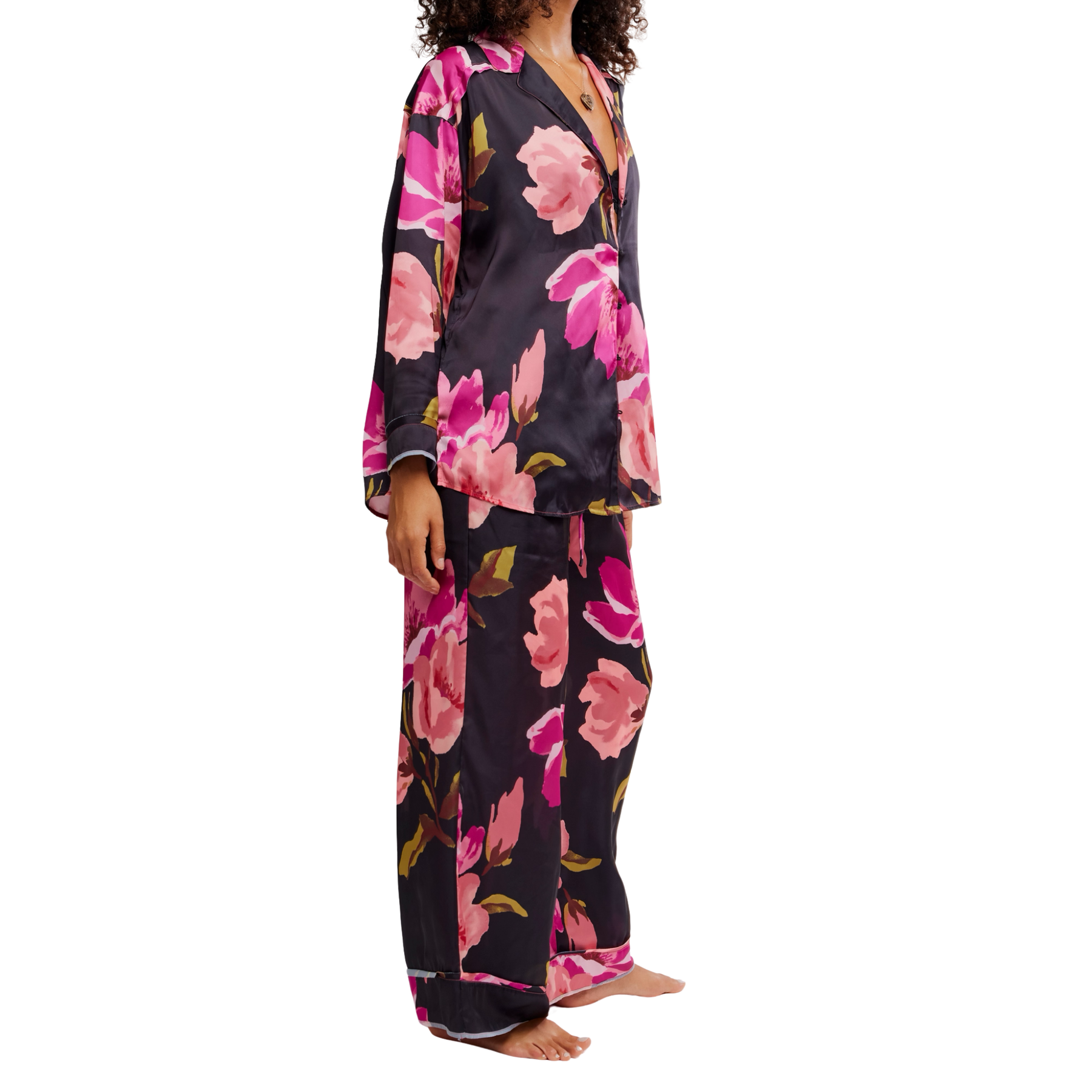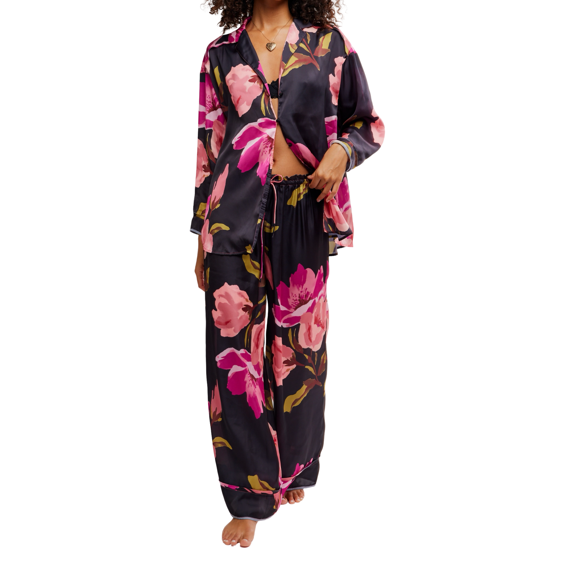 Unwind in effortless elegance with the Dreamy Days Pajama Set in Blackend by Free People — a must-have women’s luxury pajama set designed for elevated comfort. Crafted from a lightweight, breathable printed fabric, this oversized pajama set features a slouchy long-sleeve button-front top and full-length wide-leg bottoms with an elastic waistband and adjustable drawstring for the perfect fit. Soft, relaxed, and endlessly wearable, this comfortable matching sleepwear set is ideal for cozy nights, slow mornings, and stylish lounging at home.