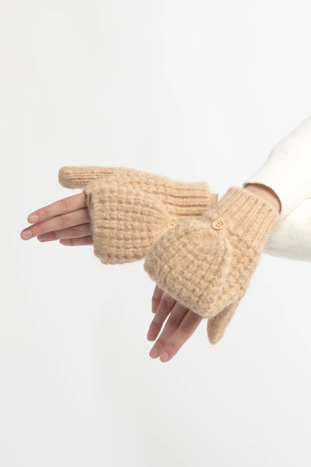 Keep your hands warm and stylish with the Nina Waffle Flip Mittens in Camel. Made from a soft wool blend, these waffle knit flip mitten gloves offer versatile wear, easily switching between fingerless and full coverage for added convenience. Perfect for chilly days, commuting, or winter accessories, they combine cozy comfort with practical style.