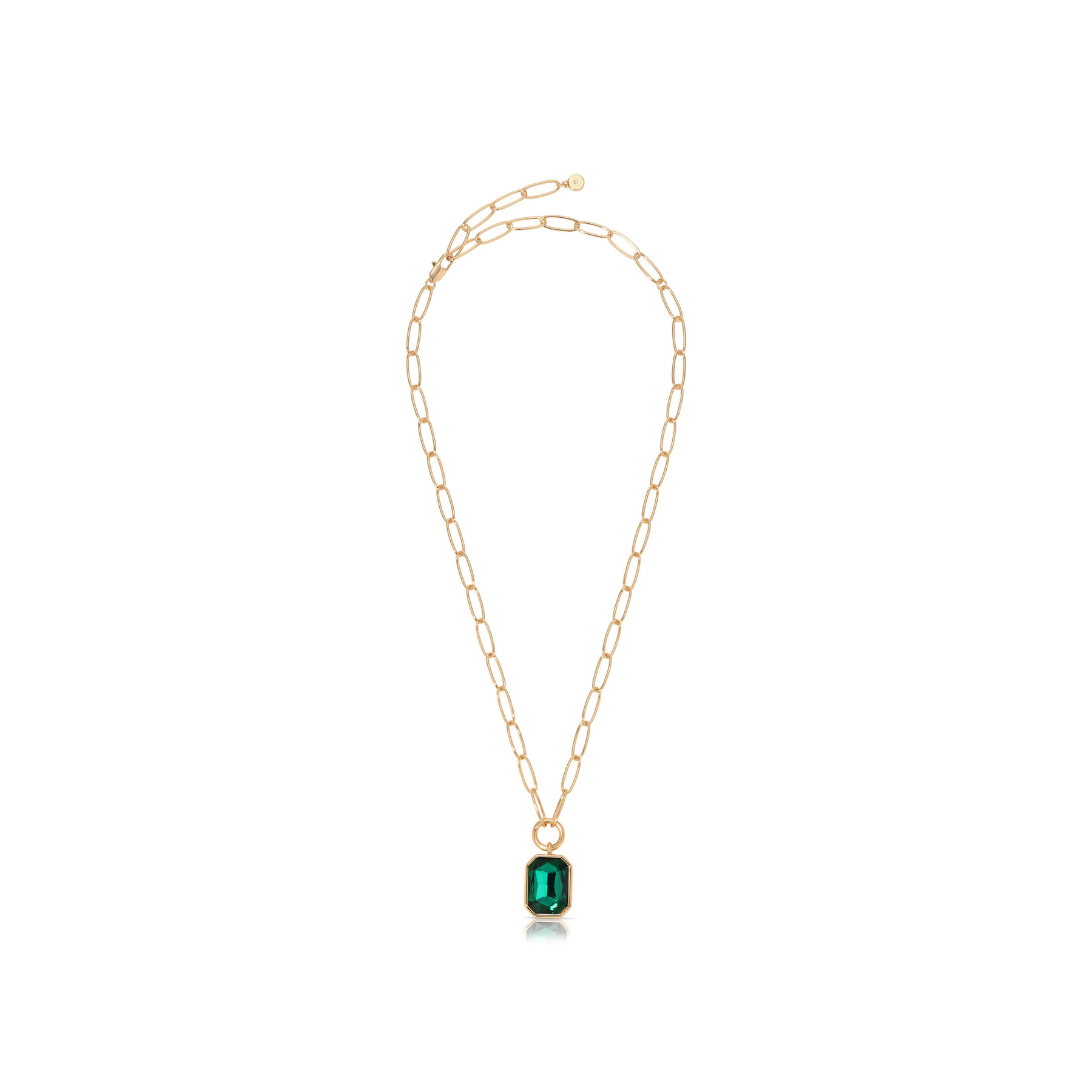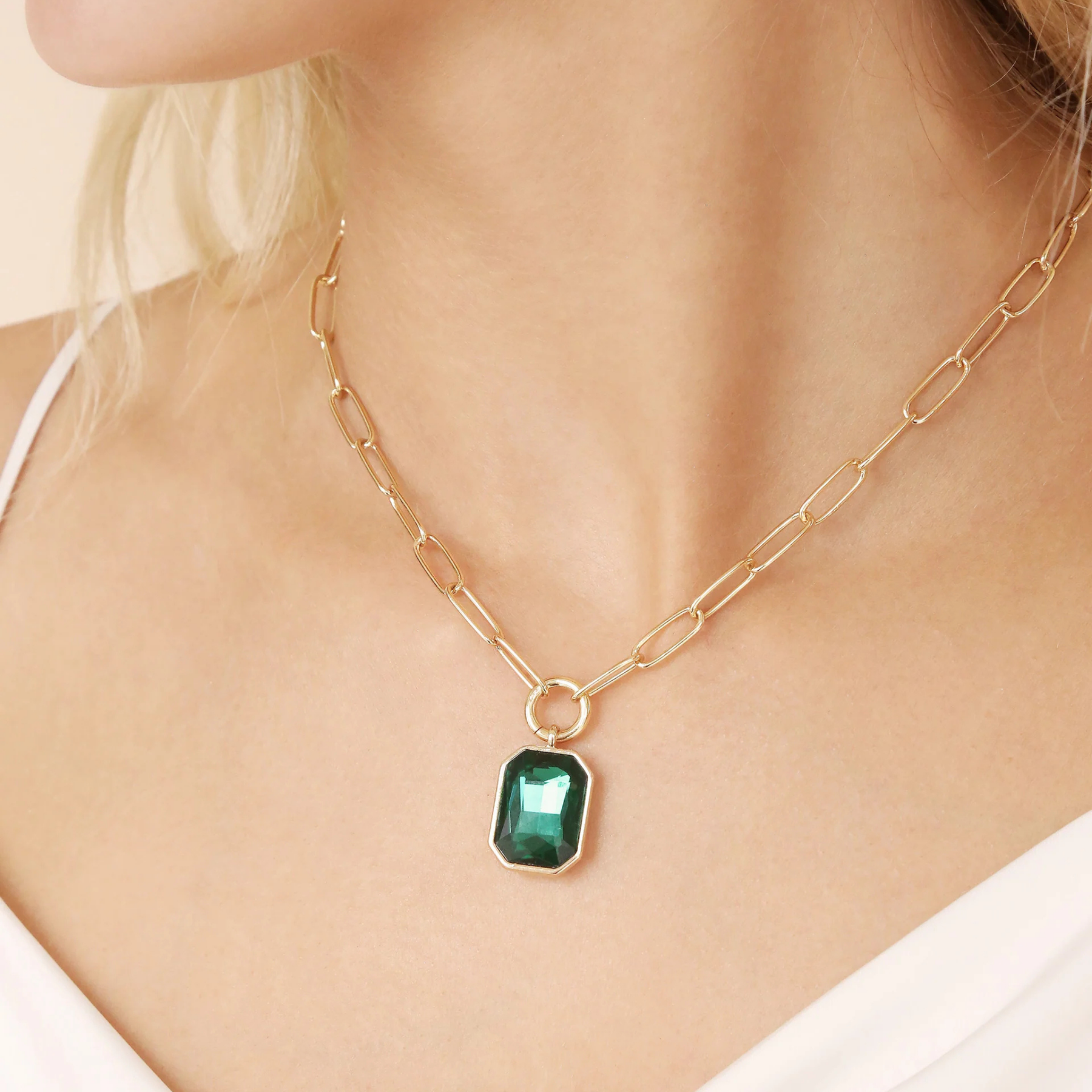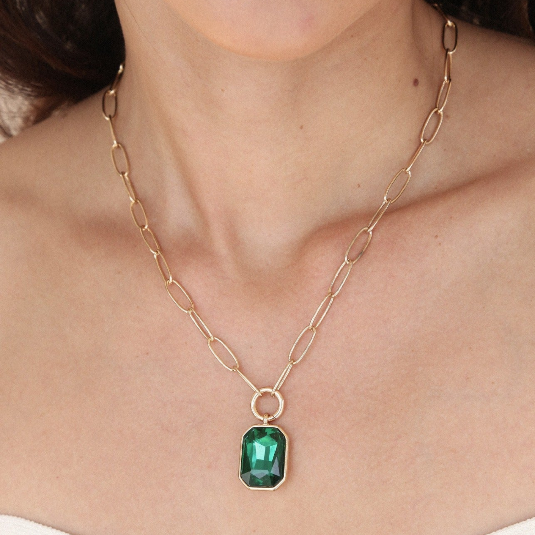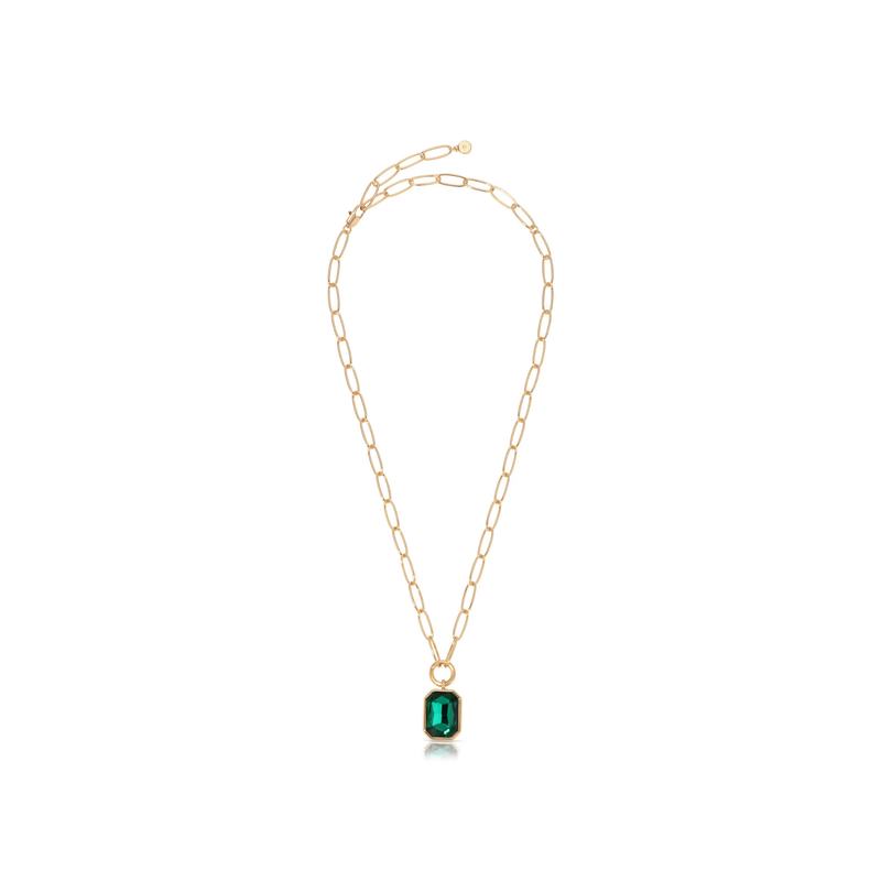Elevate your look with the Deco Pendant Necklace in Gold Green. This stunning piece features a chic paperclip chain and a single emerald-cut green crystal pendant, blending modern simplicity with vintage-inspired elegance. A timeless gold necklace that adds effortless sophistication to any outfit.