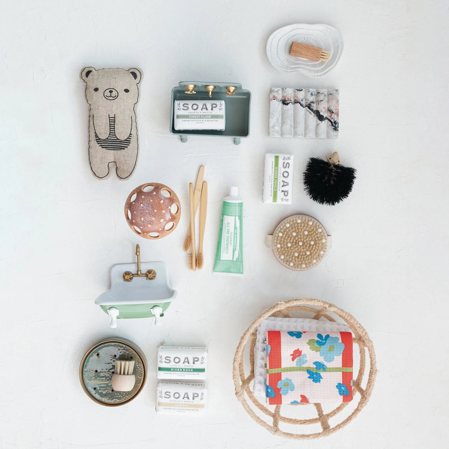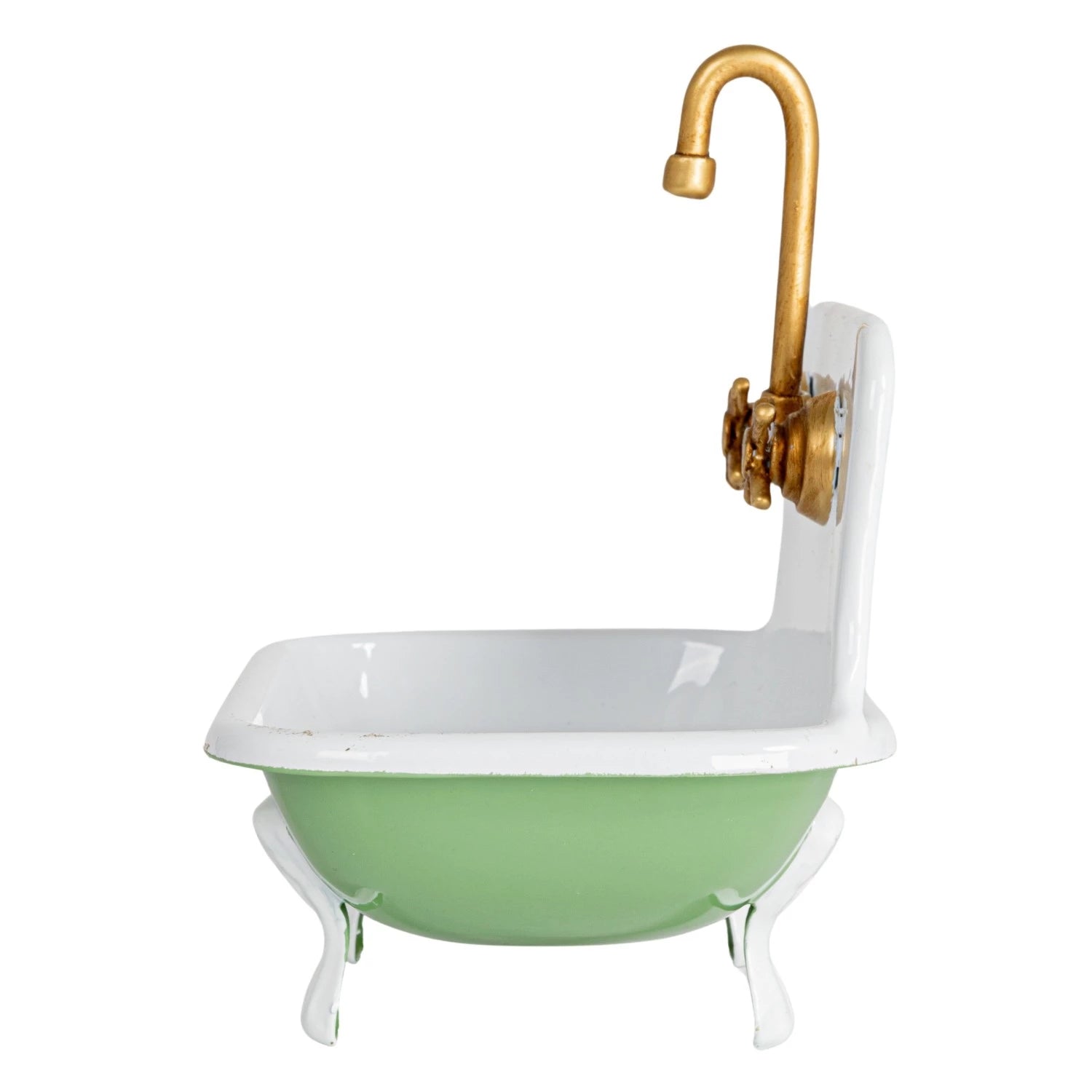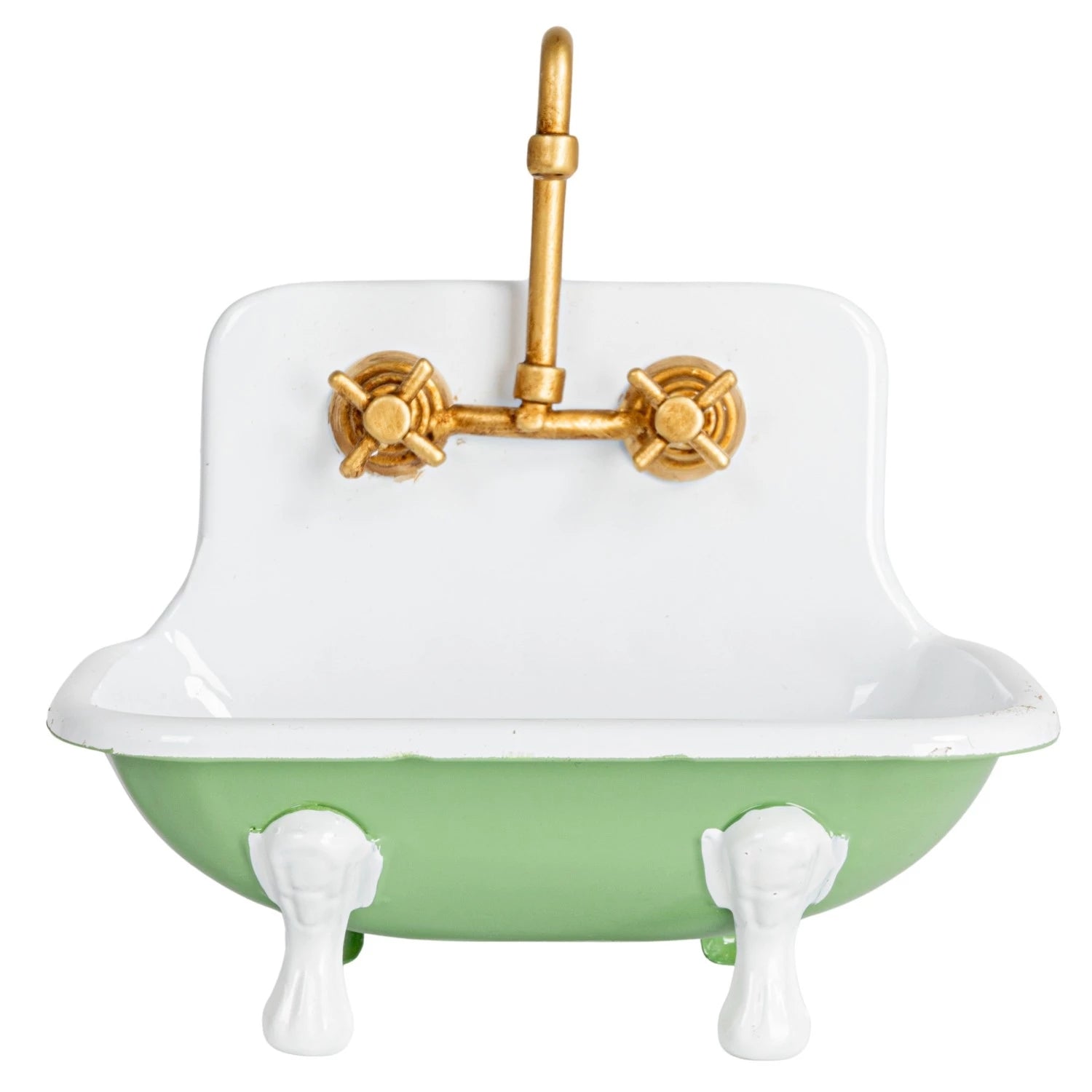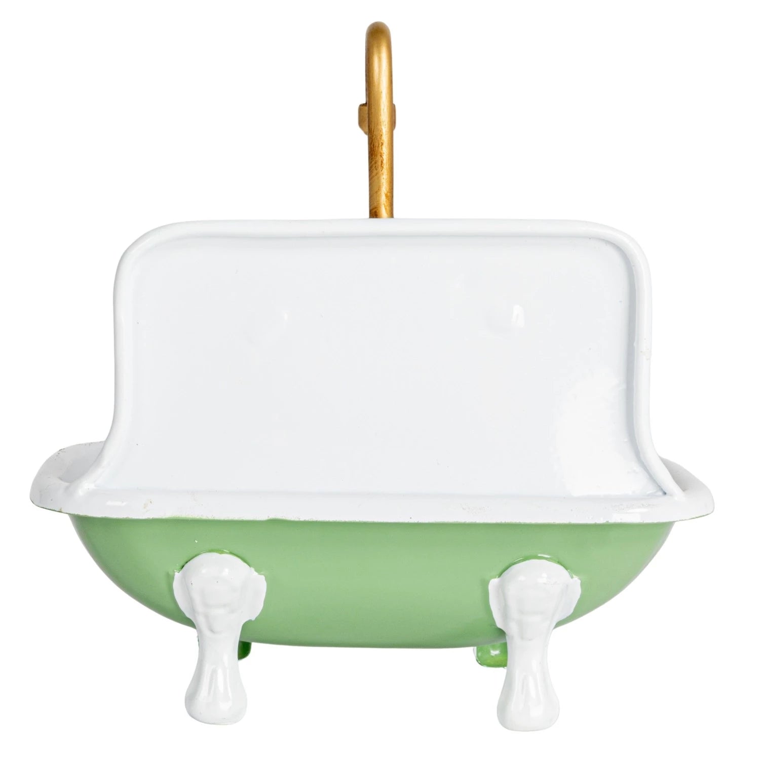 Introduce a touch of whimsy to your bathroom with our Green Sink Soap Dish. This Metal Soap Dish features a vintage sink design with a faucet, adding a playful element to your decor. The green, white, and gold finish adds a hint of nostalgia, while the square shape and size make it a perfect fit for any countertop. Perfect for industrial, farmhouse, or rustic styles, this functional art piece captures the essence of a bygone era. Each dish is unique, making it a one-of-a-kind addition to your space.