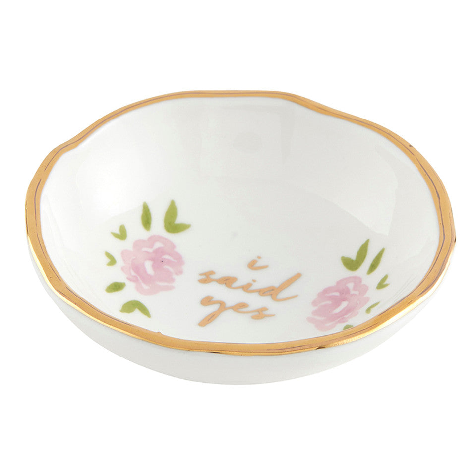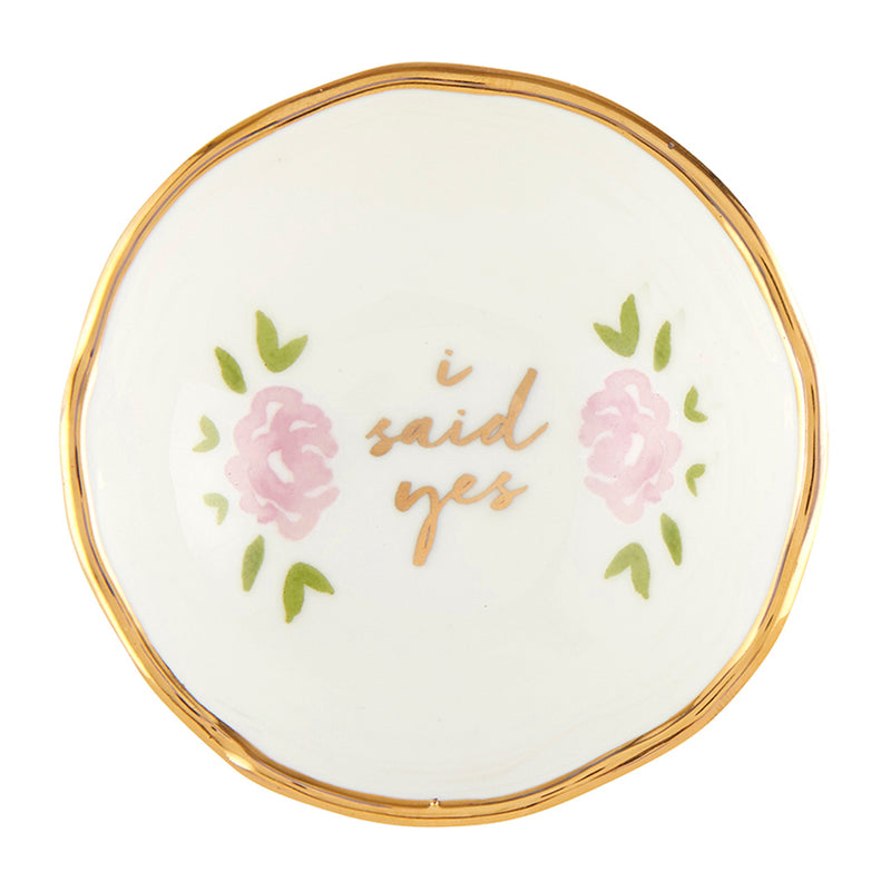 Store your precious rings in style with our "I Said Yes" Jewelry Dish. This elegant dish features stunning gold foil detailing, adding a touch of sophistication to any vanity or nightstand. Keep your rings safe and secure while also adding a touch of luxury to your everyday routine.
