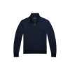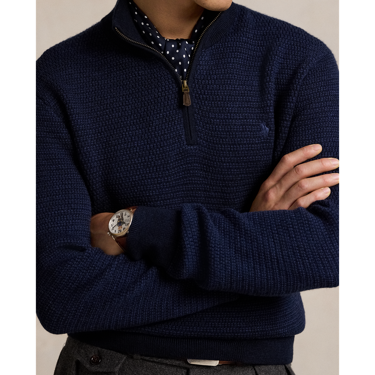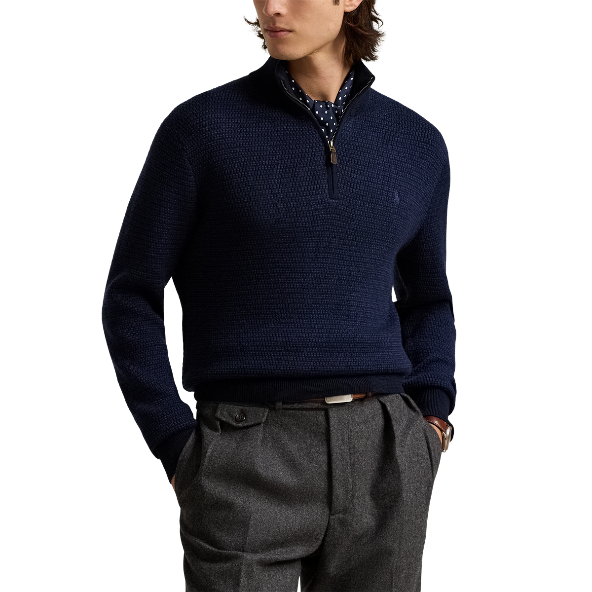 - Rib-knit mockneck. Quarter-zip front. Suede zip pull custom-developed with a "Polo" logo.