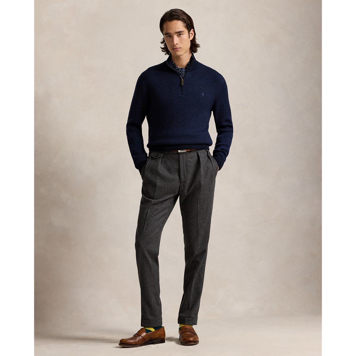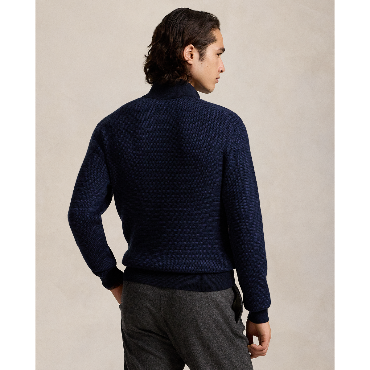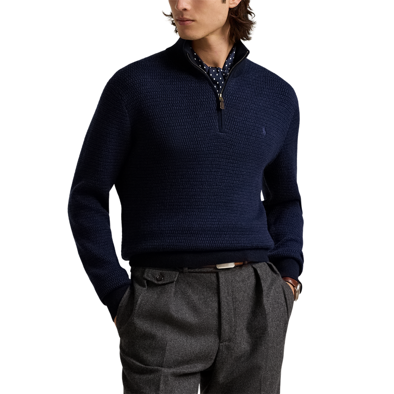 The Washable Wool Quarter-Zip Jumper in Navy by Ralph Lauren is a refined staple for elevated men’s fall fashion. Crafted from fine-gauge worsted wool in a textured-knit finish, it offers warmth, breathability, and effortless style. The classic mockneck design and signature embroidered Polo Pony add a timeless touch to this versatile men's sweater, perfect for layering or wearing on its own.