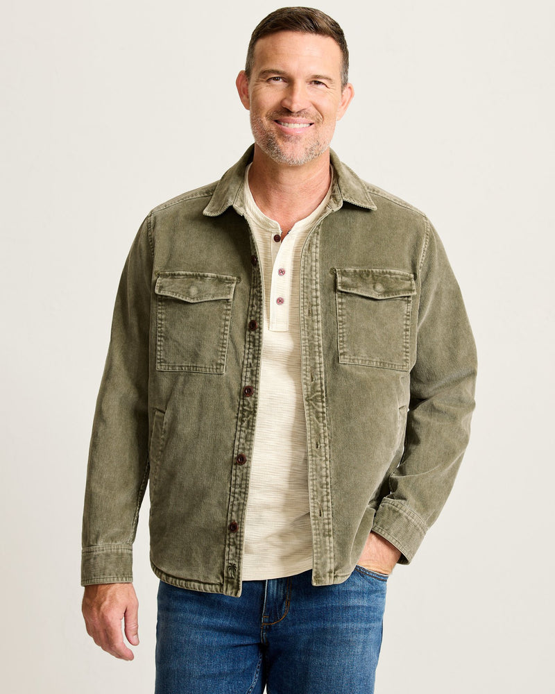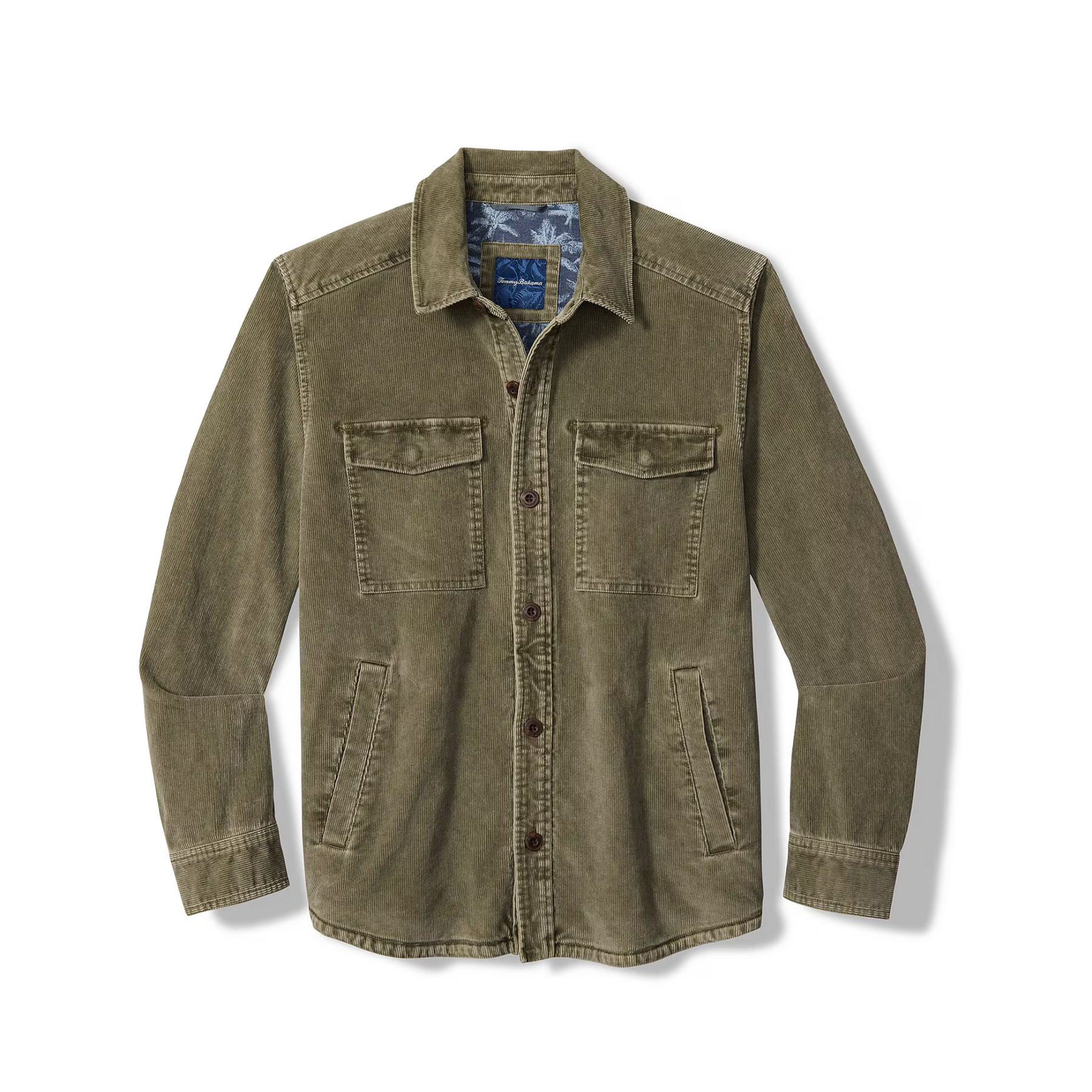 The Camden Cord Shirt Jacket in Oakmoss by Tommy Bahama blends casual comfort with refined style. Made from a soft, stretchy blend of 99% cotton and 1% spandex, this corduroy shirt jacket offers an easy, flexible fit. Subtle design touches—like structural seams and a raw hem—add a modern edge to its timeless silhouette. The rich Oakmoss color makes it versatile enough to dress up or down. A must-have men’s corduroy jacket for effortless, everyday wear.