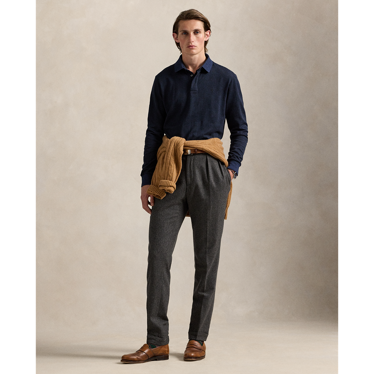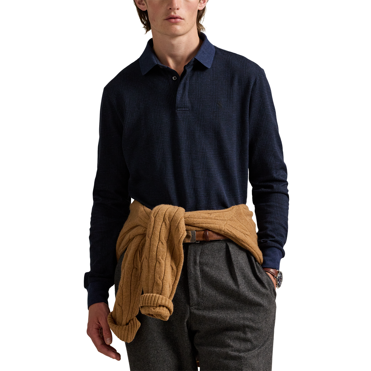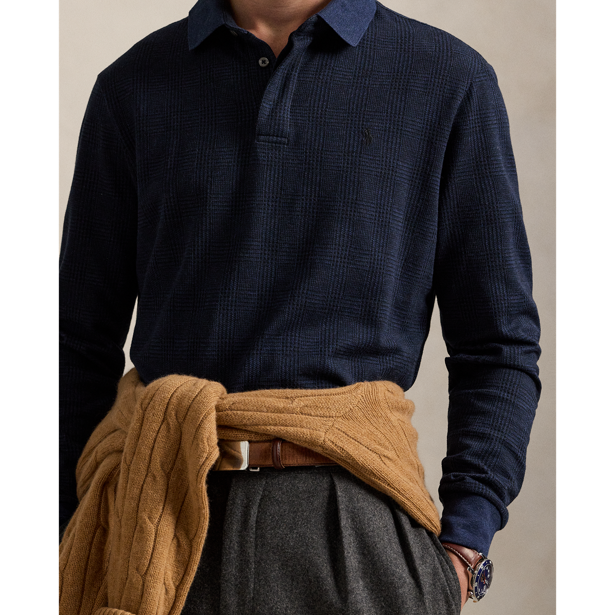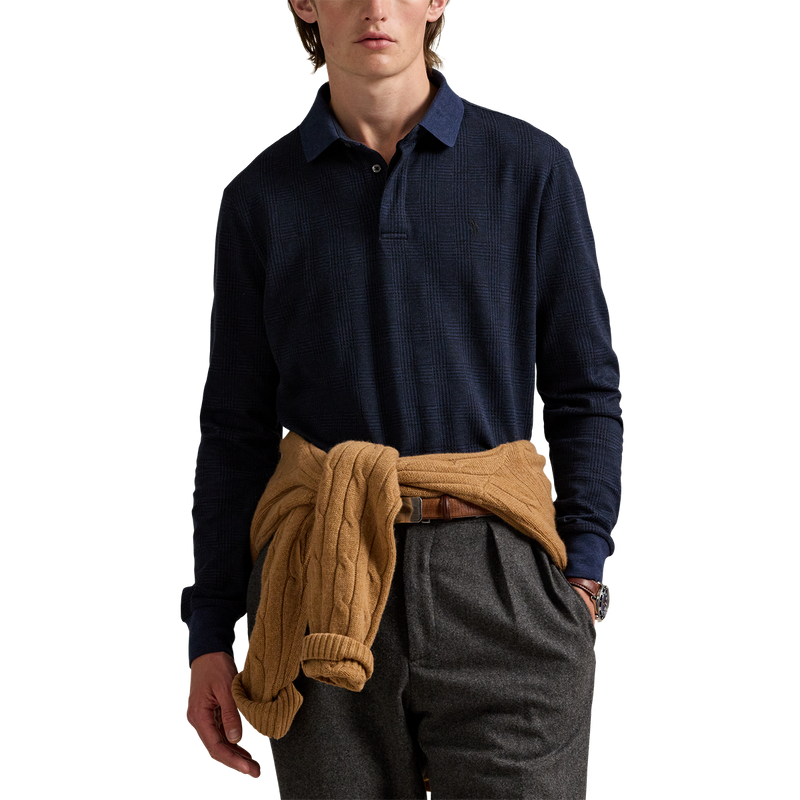 The Prince of Wales Knit Polo in Blue by Ralph Lauren combines classic style with modern details for refined men’s fall fashion. Featuring a mockneck, quarter-zip with faux-suede trim, and custom "Polo" zipper pull, this long-sleeve polo offers comfort and sophistication. Finished with banded cuffs, hem, and the signature embroidered Polo Pony, it’s a polished essential for your fall wardrobe.