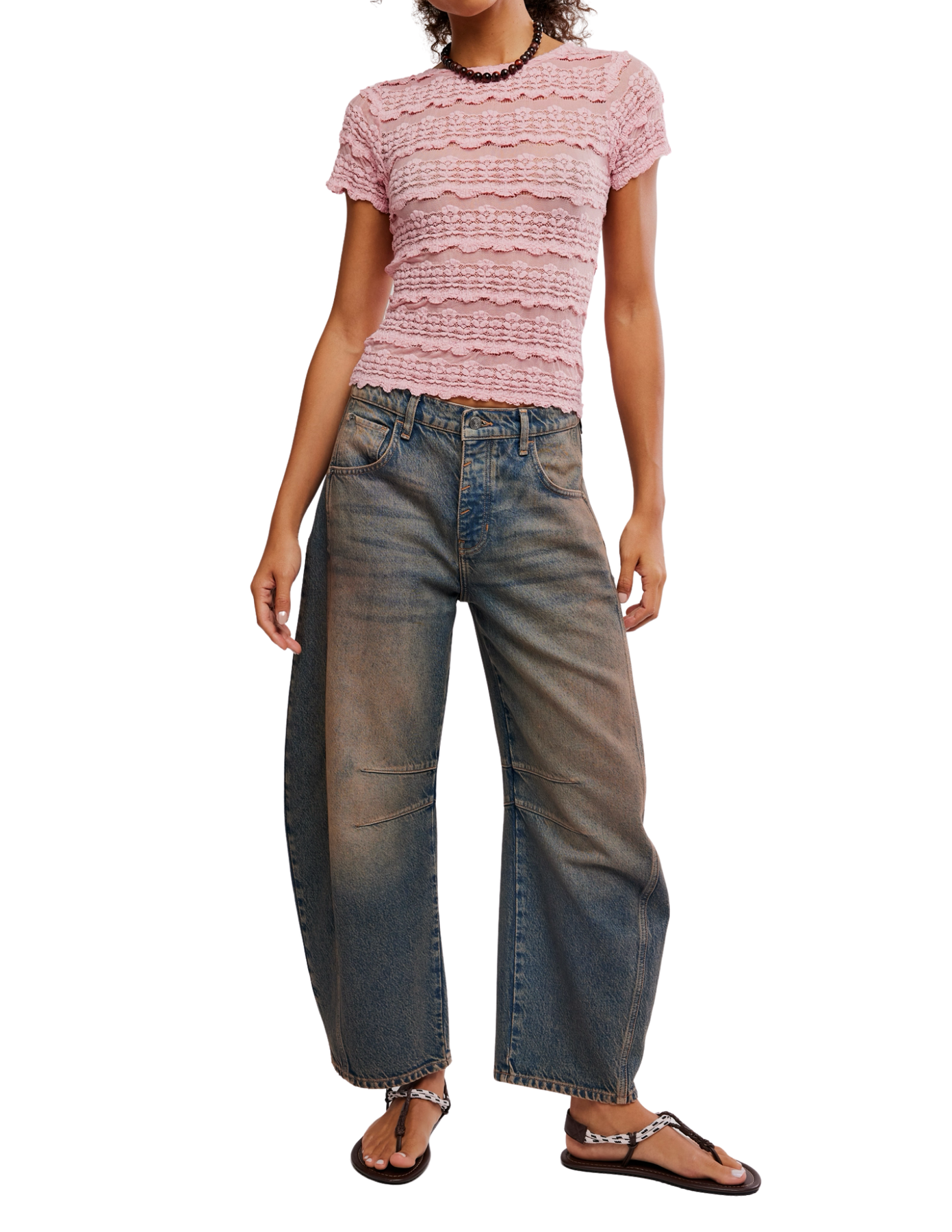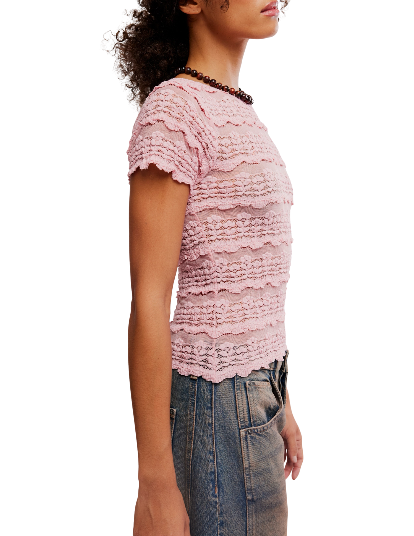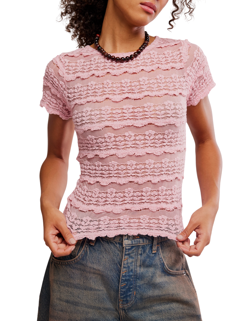 The Angelina Lace Tee in Blushing Coral by Free People brings romantic charm to an everyday essential. Designed as a fitted baby tee, it features delicate lace and mesh fabrication with a subtle striped pattern, classic crew neckline, and soft scalloped trim. Effortlessly feminine, this Free People lace tee adds a touch of romance to any outfit, perfect for elevating both casual and dressed-up looks.