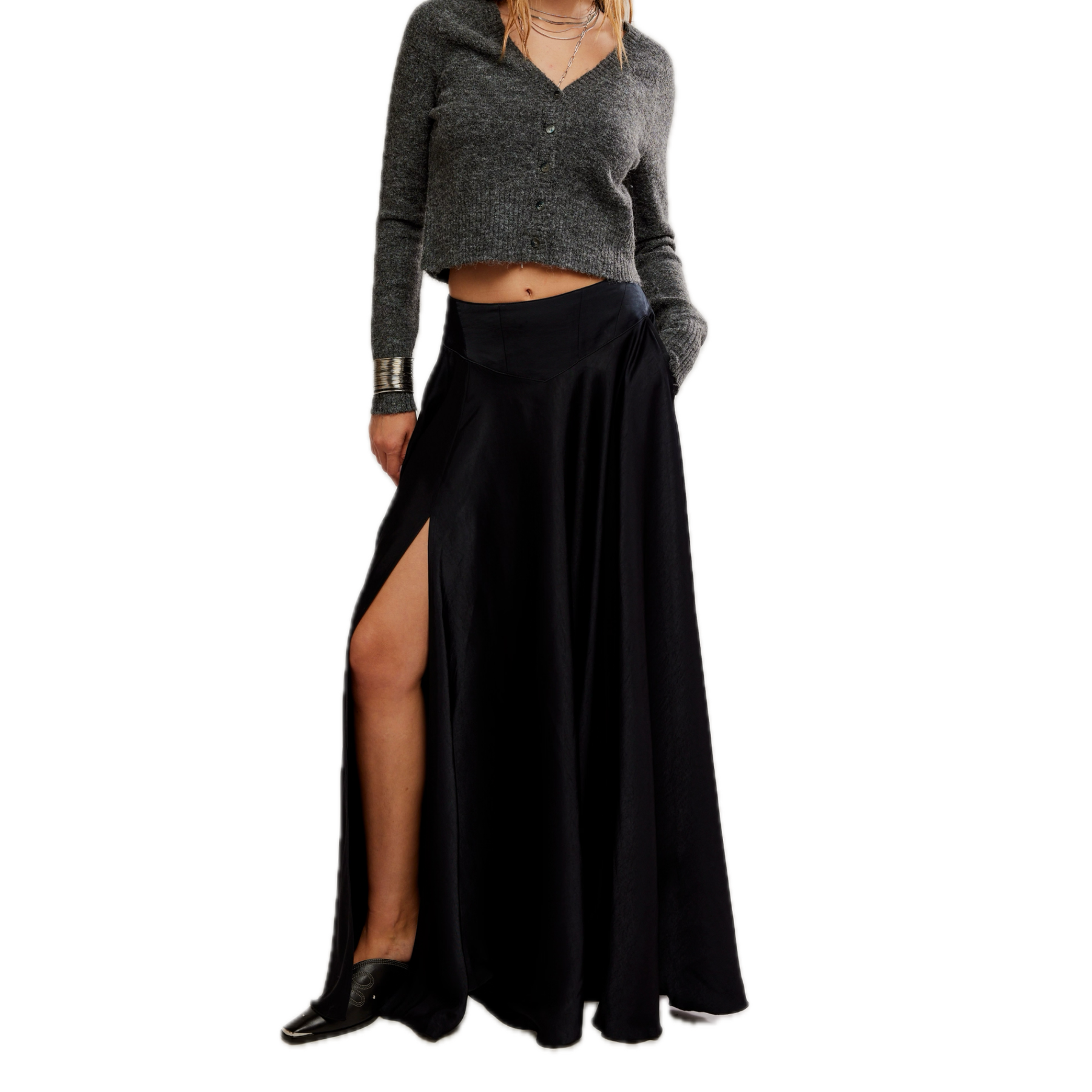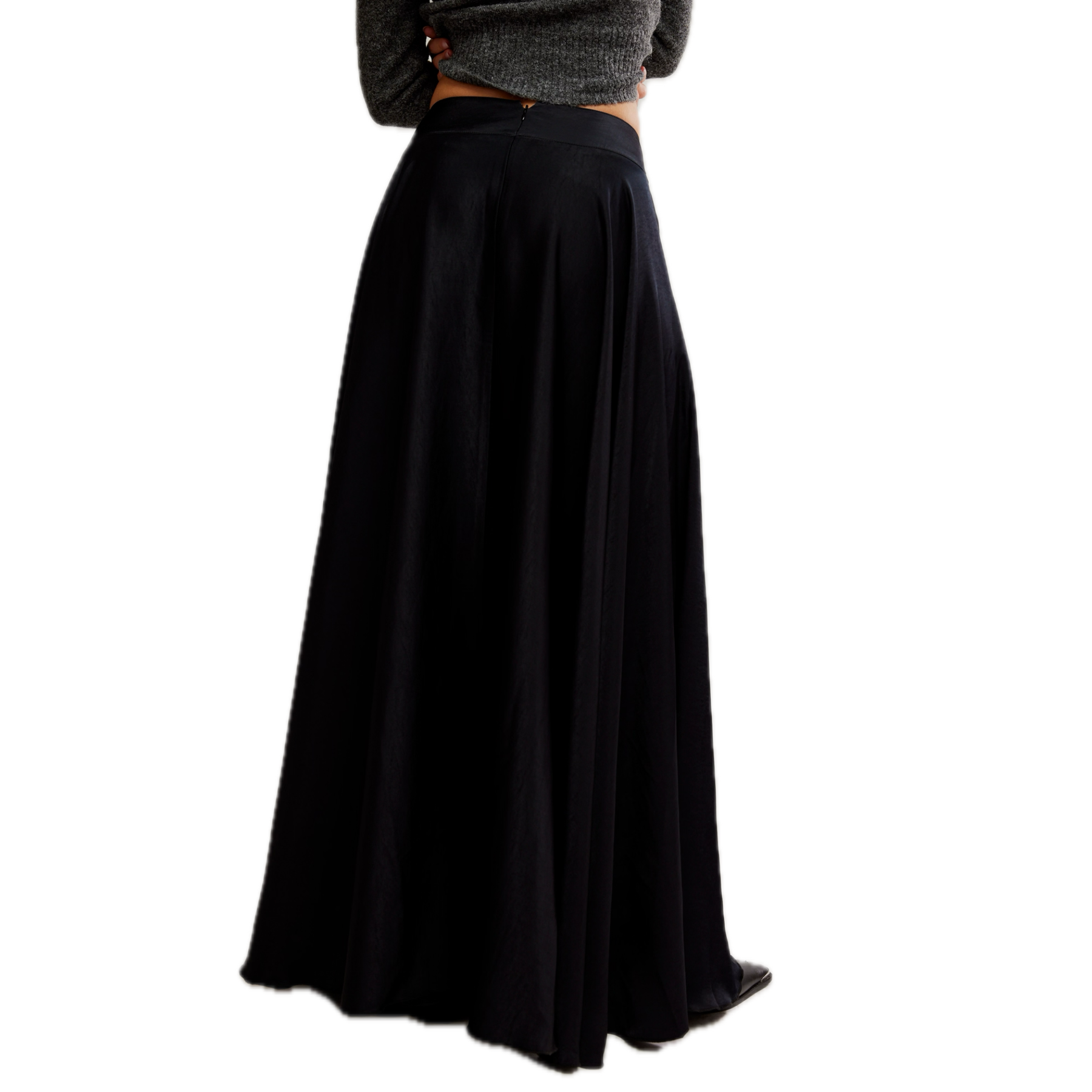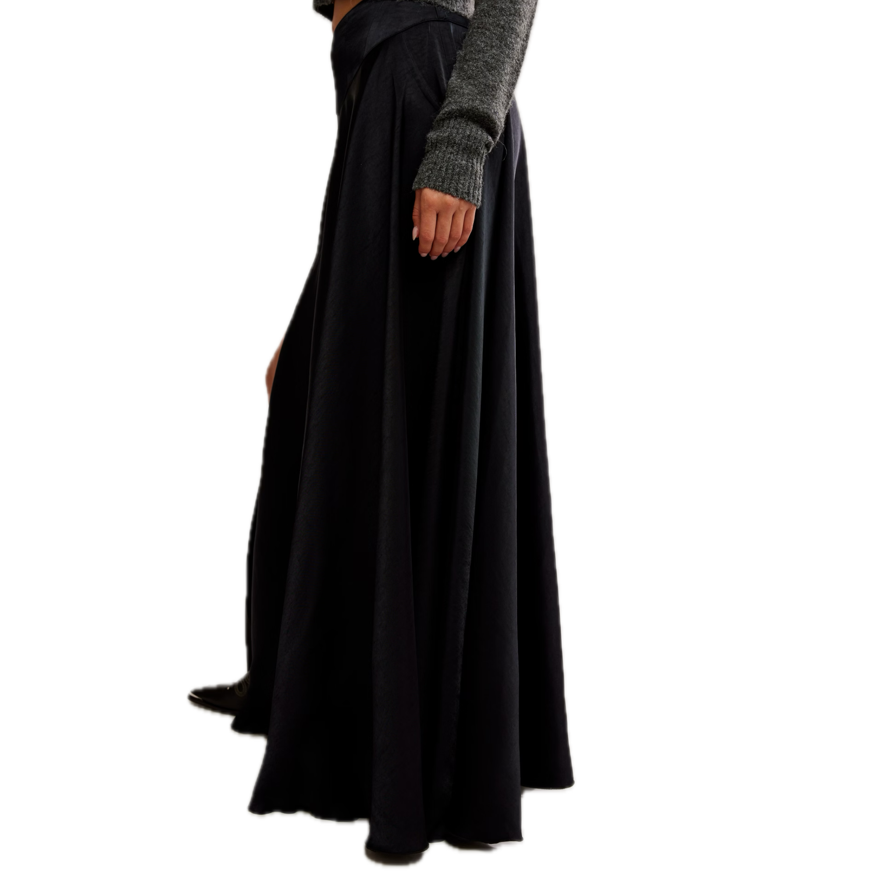 Elevate your wardrobe with the Chilco Maxi Skirt in Black by Free People, a sleek and stunning piece crafted in fluid black satin with a cascading A-line silhouette. Designed with a pointed waistband, mid-rise fit, and a subtle side slit for graceful movement, this black satin maxi skirt also features side pockets and a hidden back zipper for a clean, effortless finish. A modern essential for both day-to-night and elevated everyday looks.