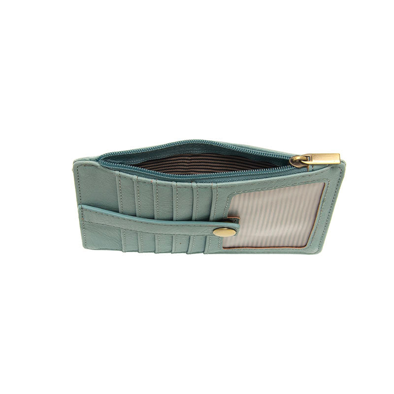 - 4″ High, 5.5″ Wide, .25″ Deep - Top zip closure on edge - 6 Credit card pockets - ID Window Pocket - Exterior passport pocket - Striped lining - Brass plated hardware - 100% Vegan leather (polyurethane)
