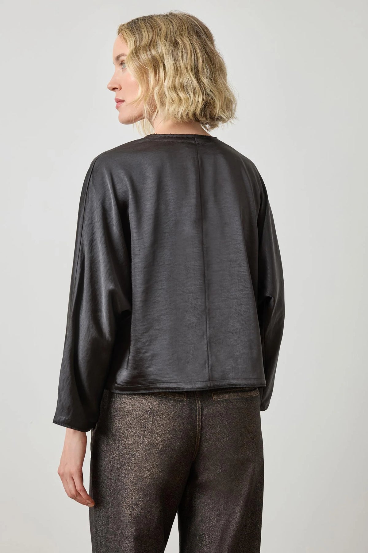 Elevate your style with the Satin V-Neck Dolman in Black by Lilla P, crafted from luxe satin twill for a fluid, refined drape. Designed with an oversized fit and raw-edge neckline, this modern dolman-style top offers effortless elegance. Pair it with coordinating satin bottoms, layer it over a satin maxi dress, or style it with denim for a chic, versatile look that moves from day to night with ease.