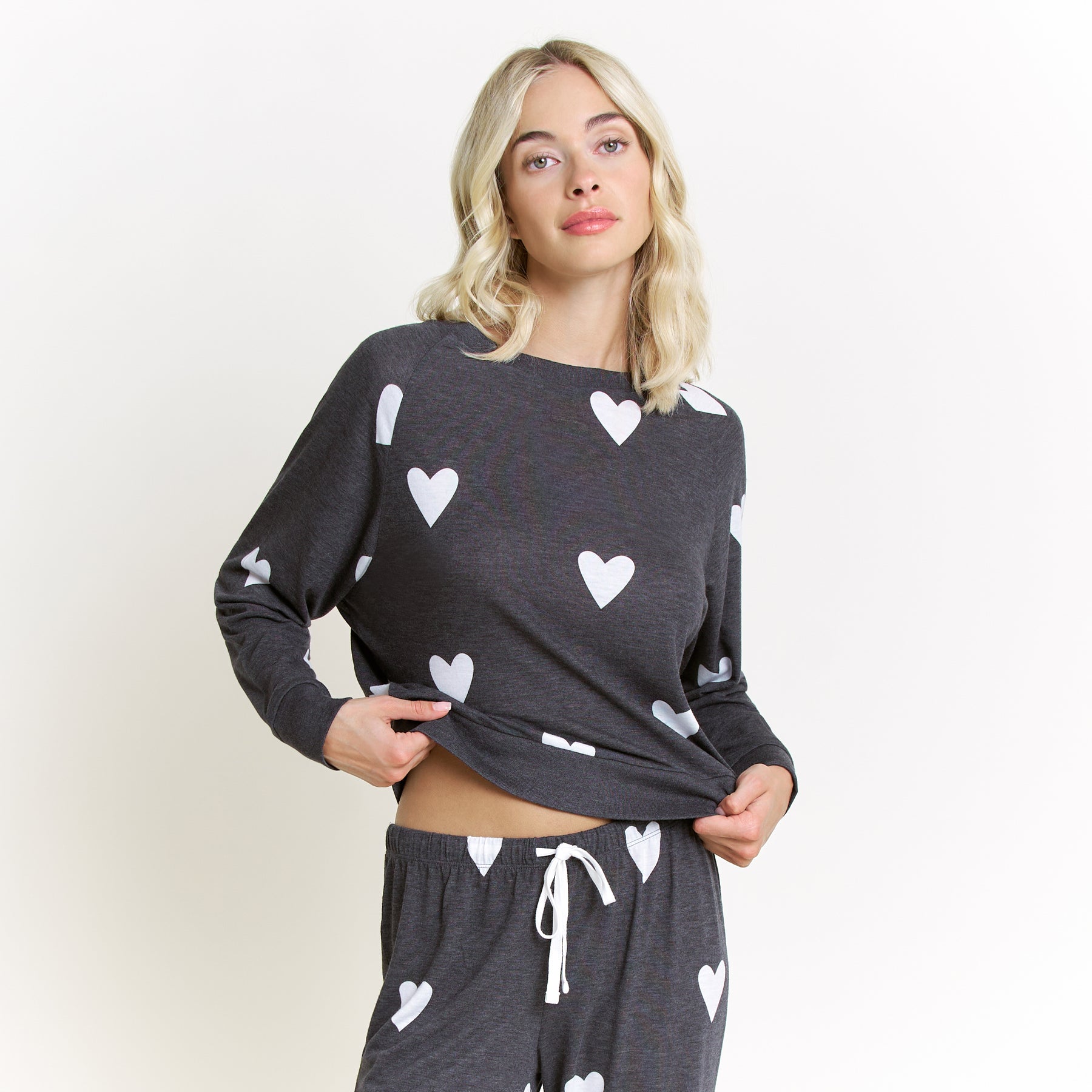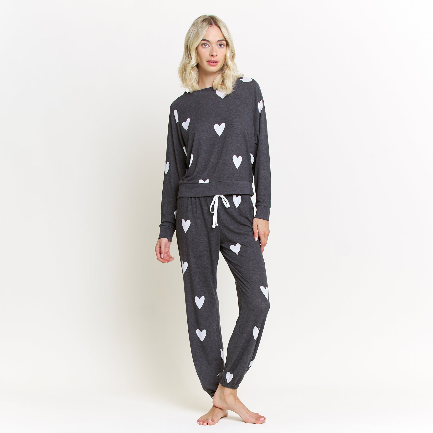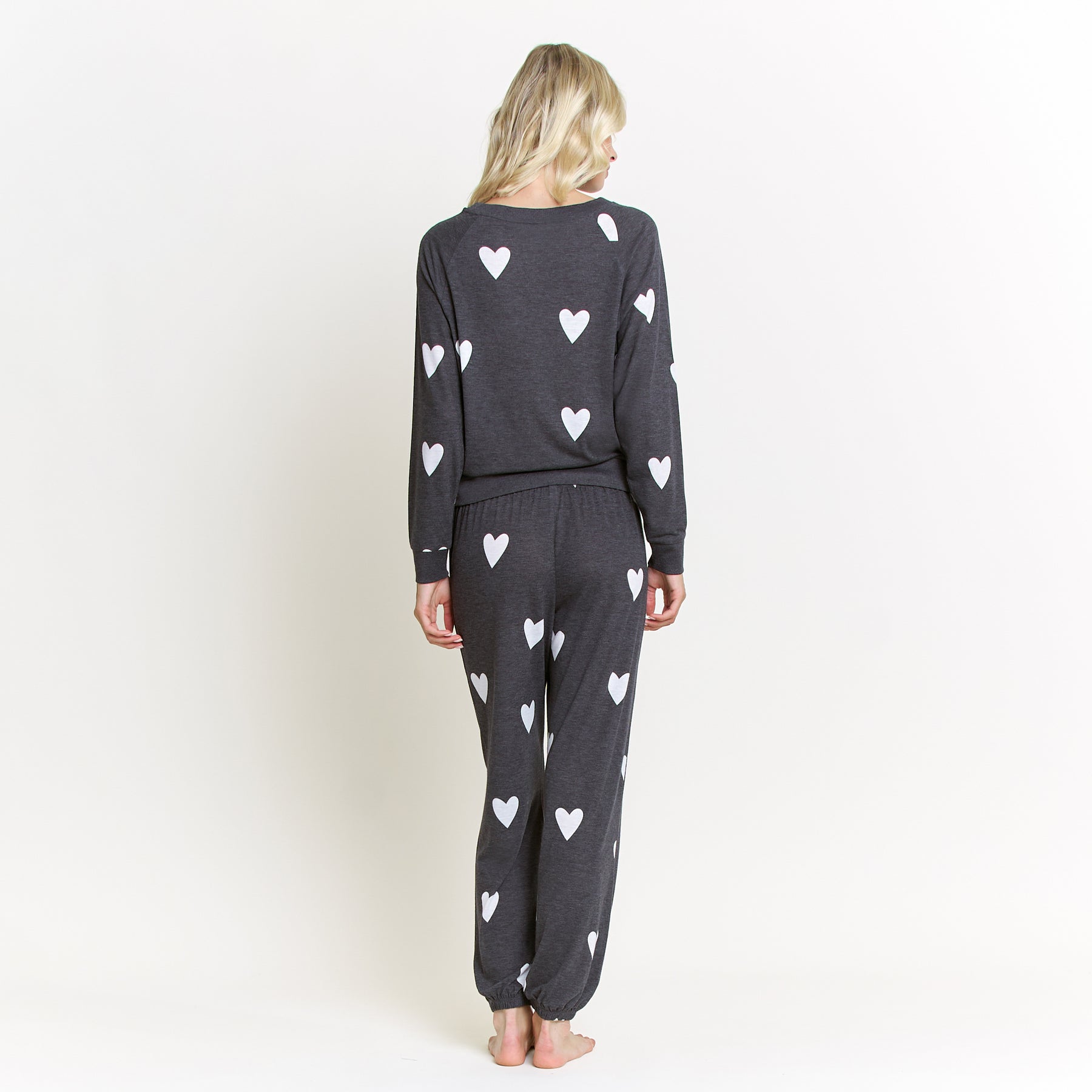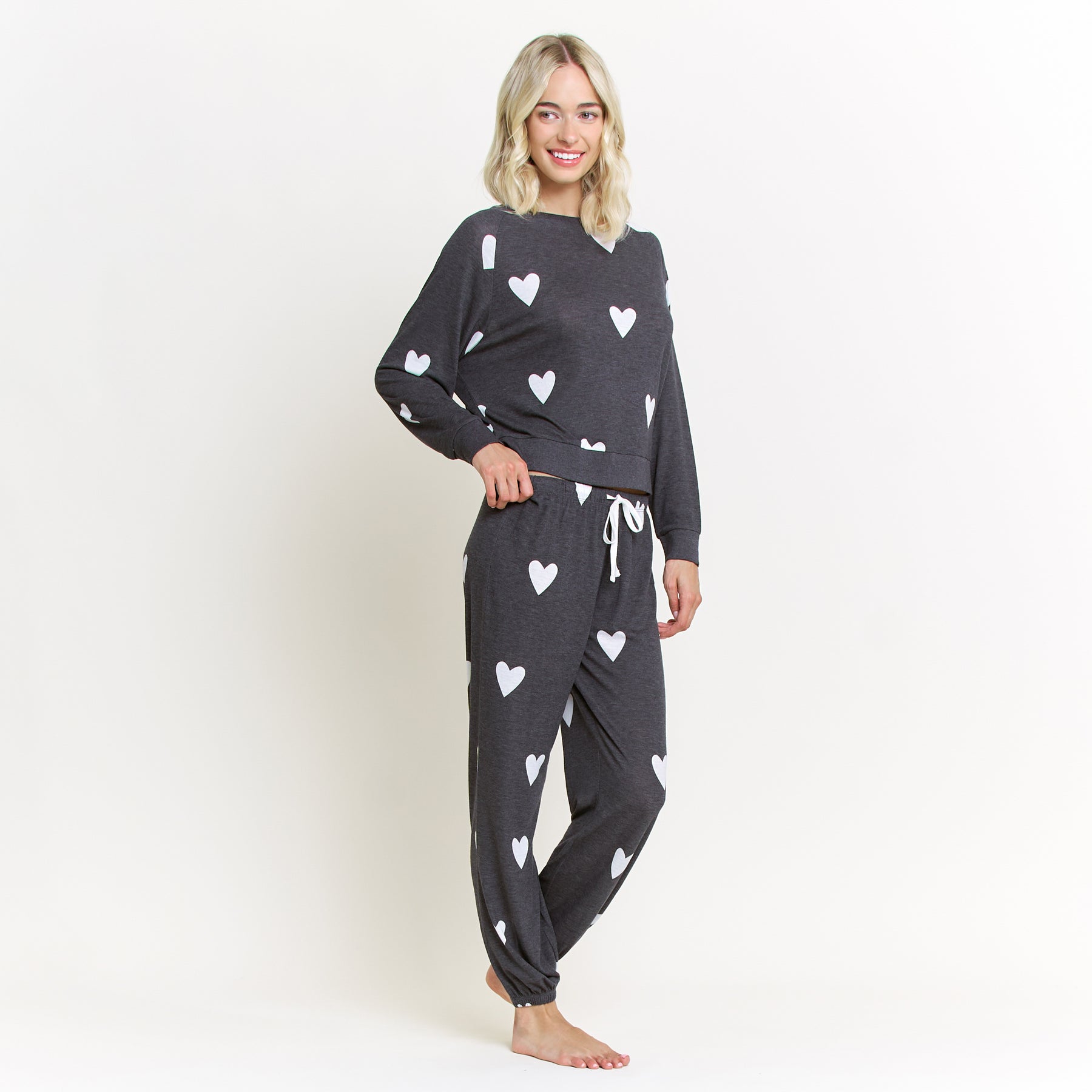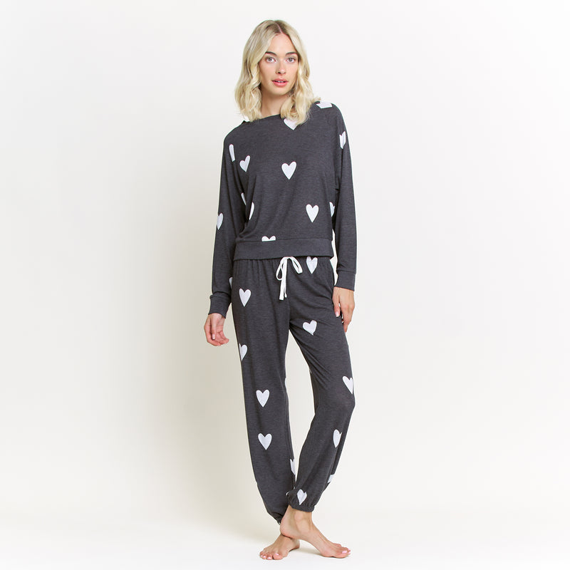 A year-round favorite and one of our best-selling lounge sets, the Star Seeker Lounge Set blends effortless comfort with playful charm. Designed in a black base with white heart print, this matching set is perfect for lounging, relaxing, or casual everyday wear. The raglan, crew-neck long sleeve top offers a relaxed, flattering fit, while the drawstring jogger provides all-day comfort and easy adjustability. Crafted from a lightweight brushed jersey, this set feels soft against the skin while remaining breathable enough for every season. Whether you’re staying in or stepping out for errands, it’s a go-to look that never goes out of style.