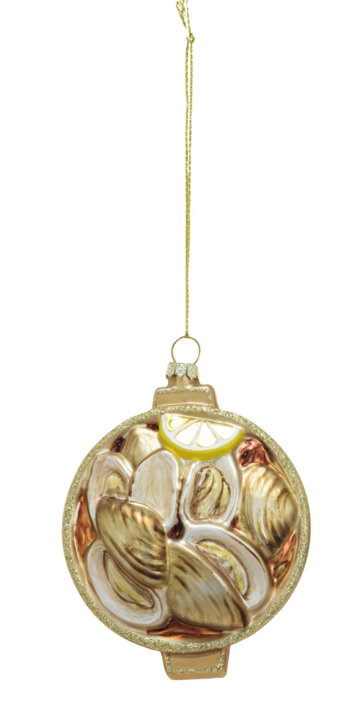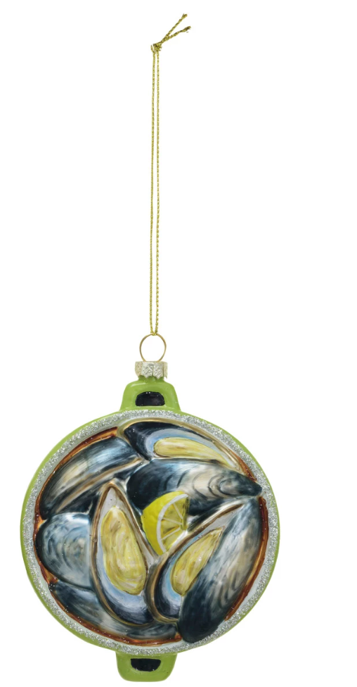 Indulge in the artistry of our Hand-Painted Ornament. Each 4-1/4"H glass ornament features exquisite hand-painted mussels and steamer clams, accented with glitter and presented in two stunning styles. Add a touch of sophistication and luxury to your holiday décor with this unique piece.