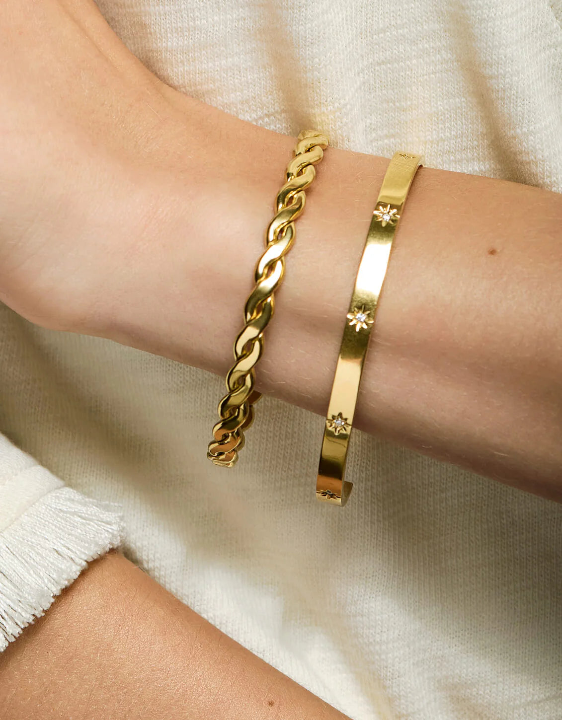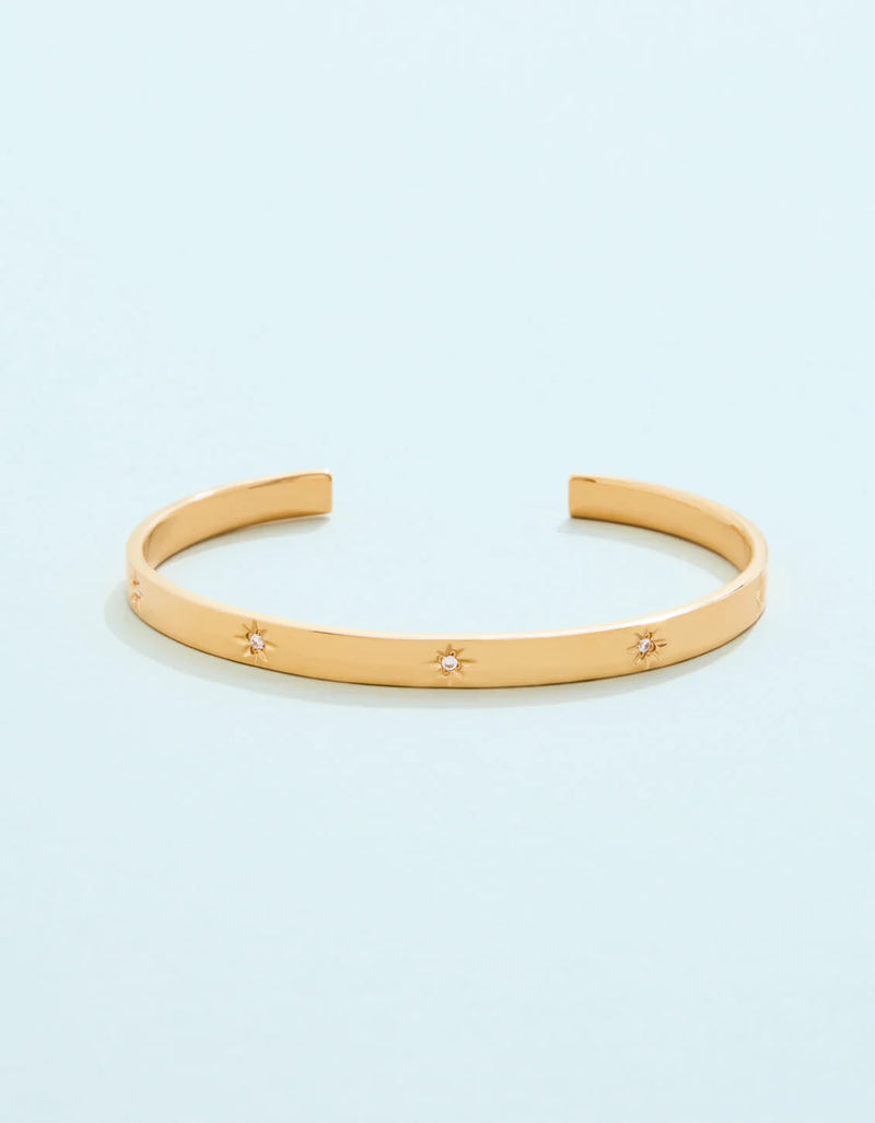 The Starlight Cuff in Gold by Spartina wraps your wrist in delicate starburst jewelry, creating a dazzling gold cuff bracelet you’ll never want to take off. Crafted with tarnish-free, water-resistant 14kt gold vacuum plating, this versatile cuff is designed to shine through everyday wear, exercise, showers, and sun-soaked beach days. Perfect for stacking or mixing and matching, the Starlight Cuff adds effortless sparkle and modern elegance to any look.