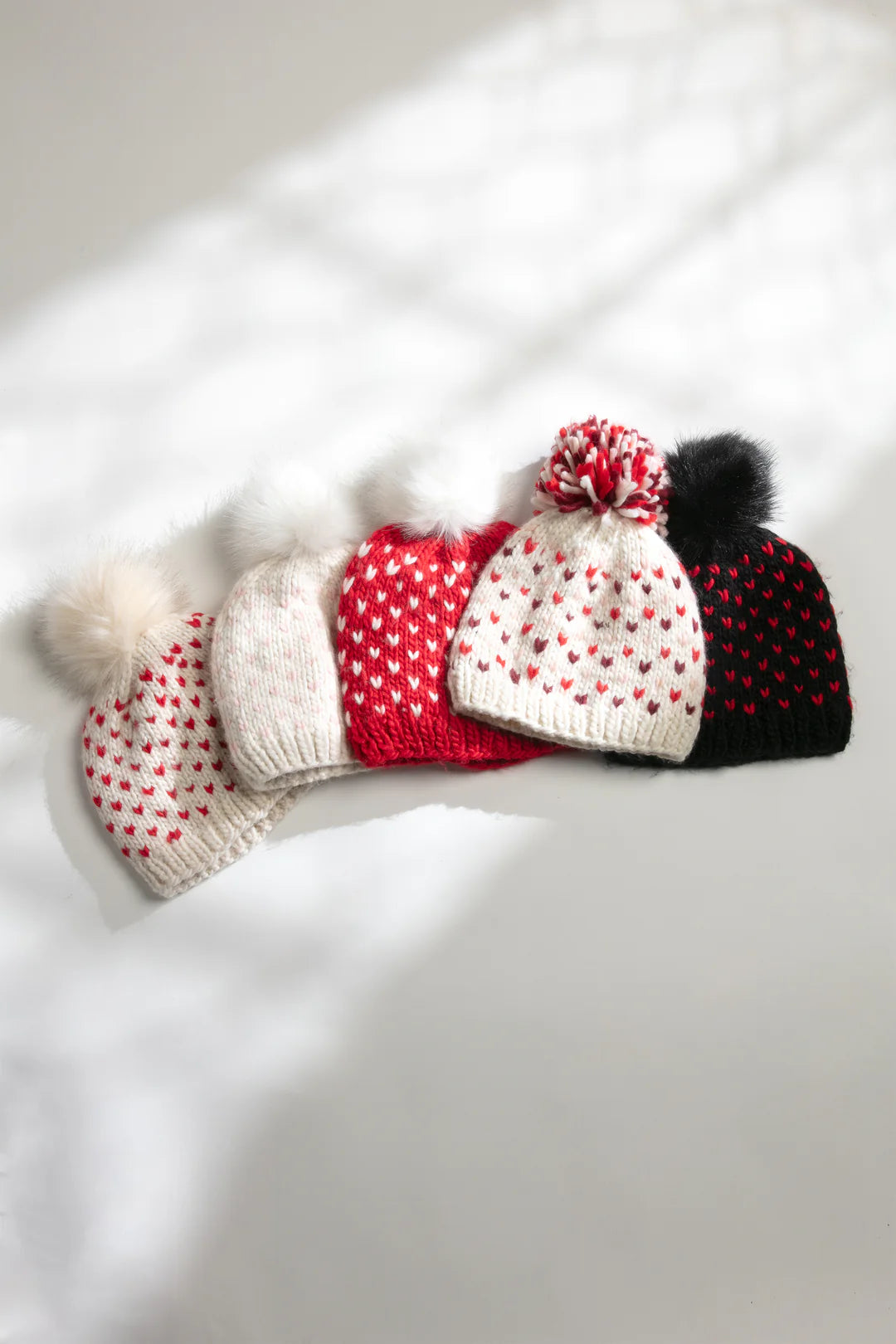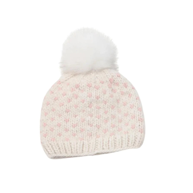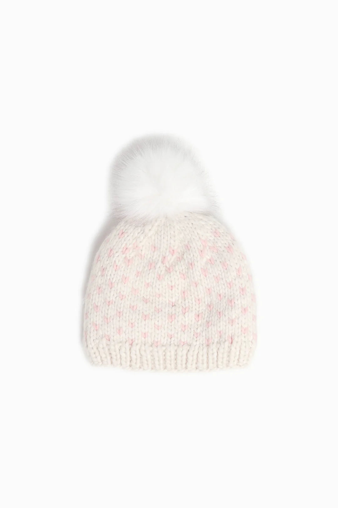 Introducing our Little Hearts Pompom Hat in Blush. Stay cozy and trendy with this elegant hat adorned with delicate hearts and a playful pompom. Made with premium materials, it is the perfect winter accessory for any luxurious ensemble. Keep your head warm and your style elevated with this exclusive piece.