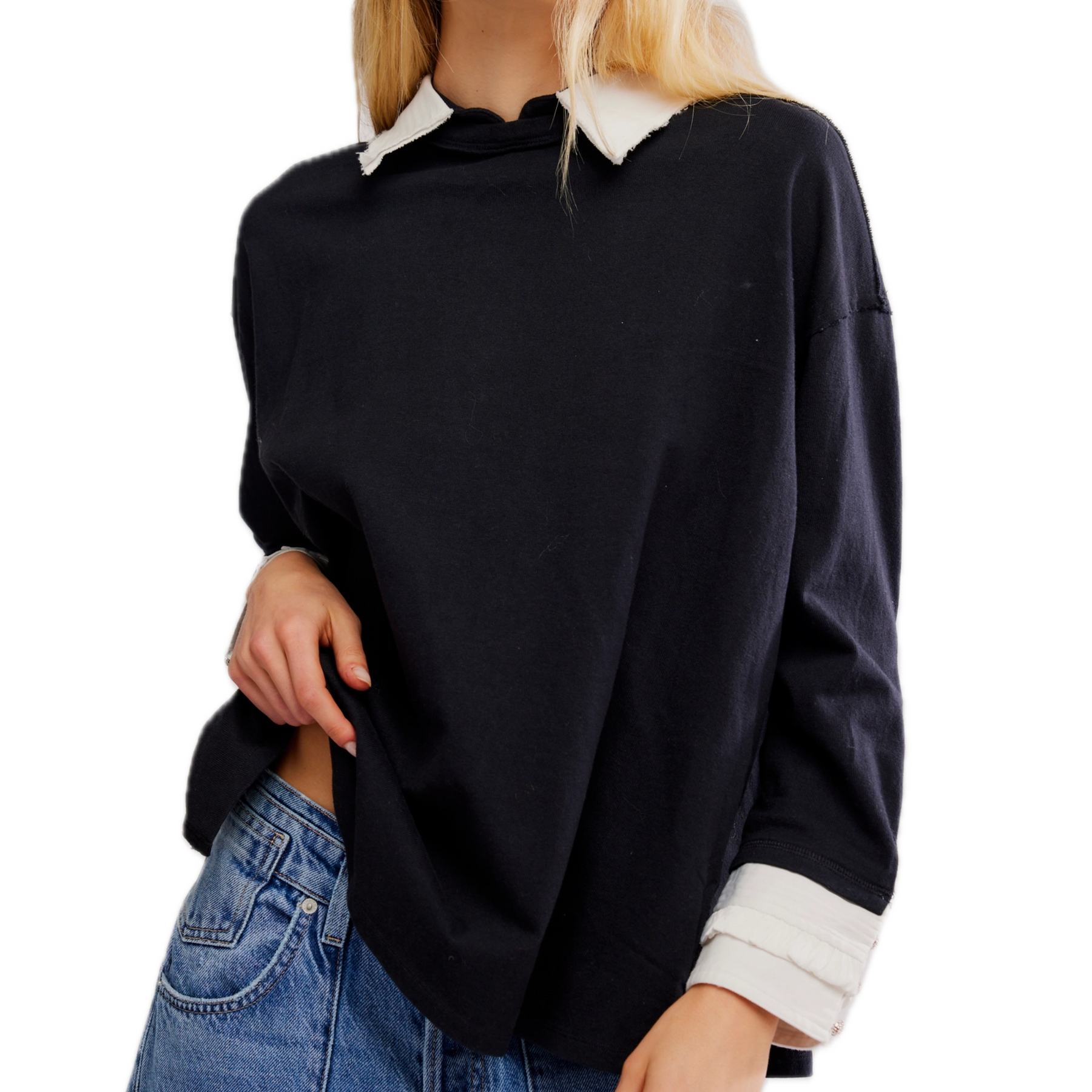 The Gianna Twofer in Black by Free People gives a fresh, preppy twist to your fall wardrobe with its effortless 2-in-1 design. Featuring a boxy, oversized fit, colorblock collar, and frayed trim, this versatile top is perfect for dressing down with denim or pairing with a sleek skirt. An easy go-to for bold, layered style all season long.