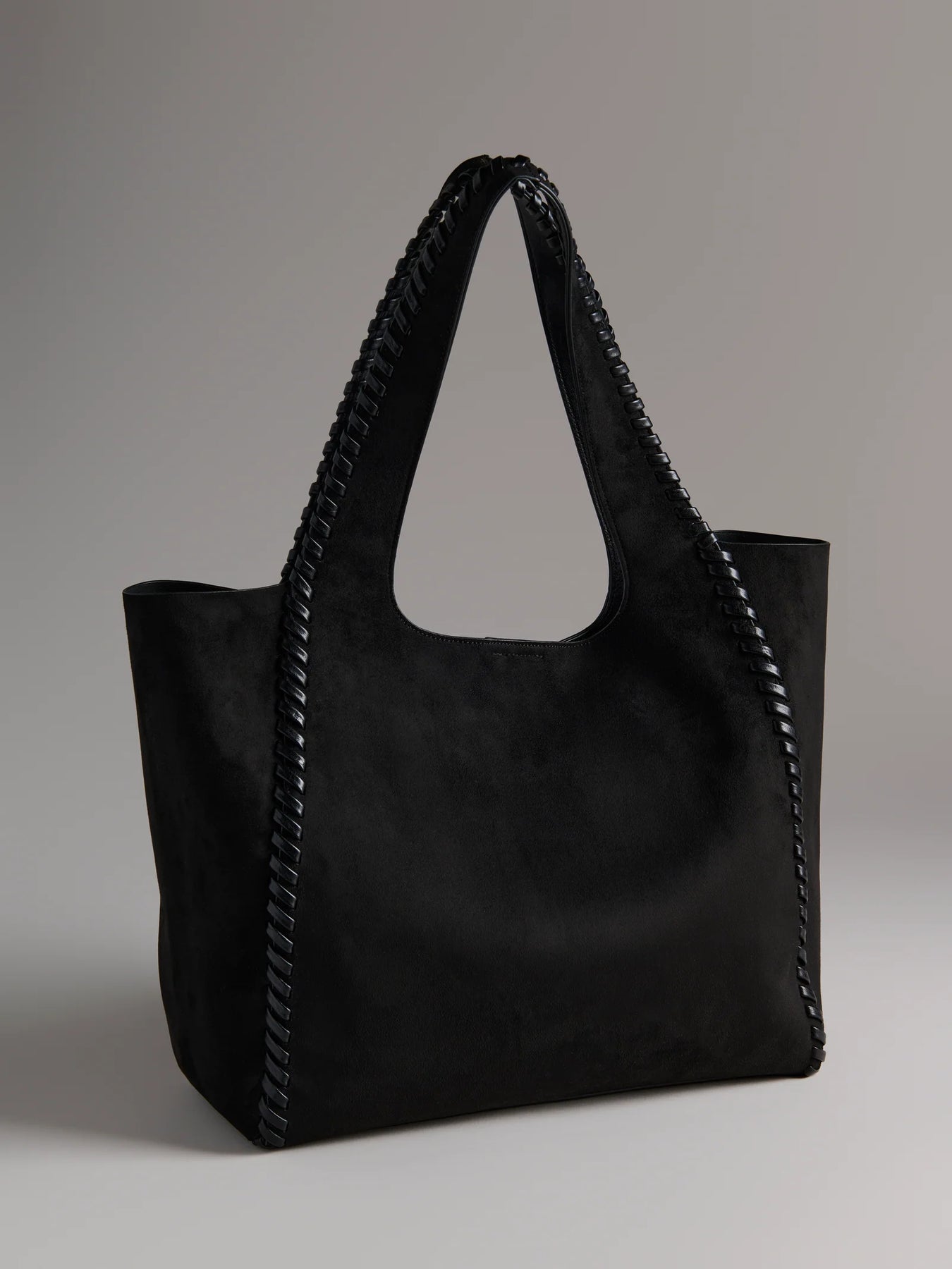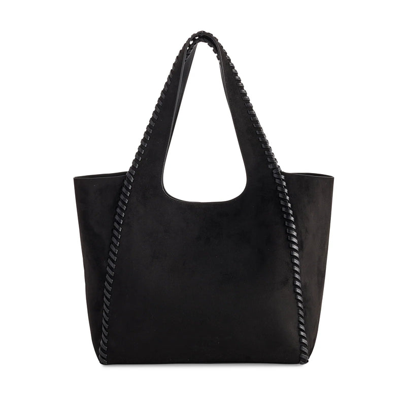 The Piper Tote in Black is your ultimate everyday companion. Crafted from soft, suede-like material, this spacious tote combines style and practicality with double shoulder straps and a secure magnetic snap closure. Inside, zip and slip pockets keep your essentials neatly organized. With a clean silhouette and subtle whipstitch detailing, this black tote bag adds a polished, modern touch to any look.