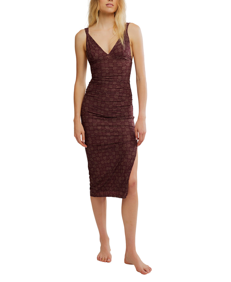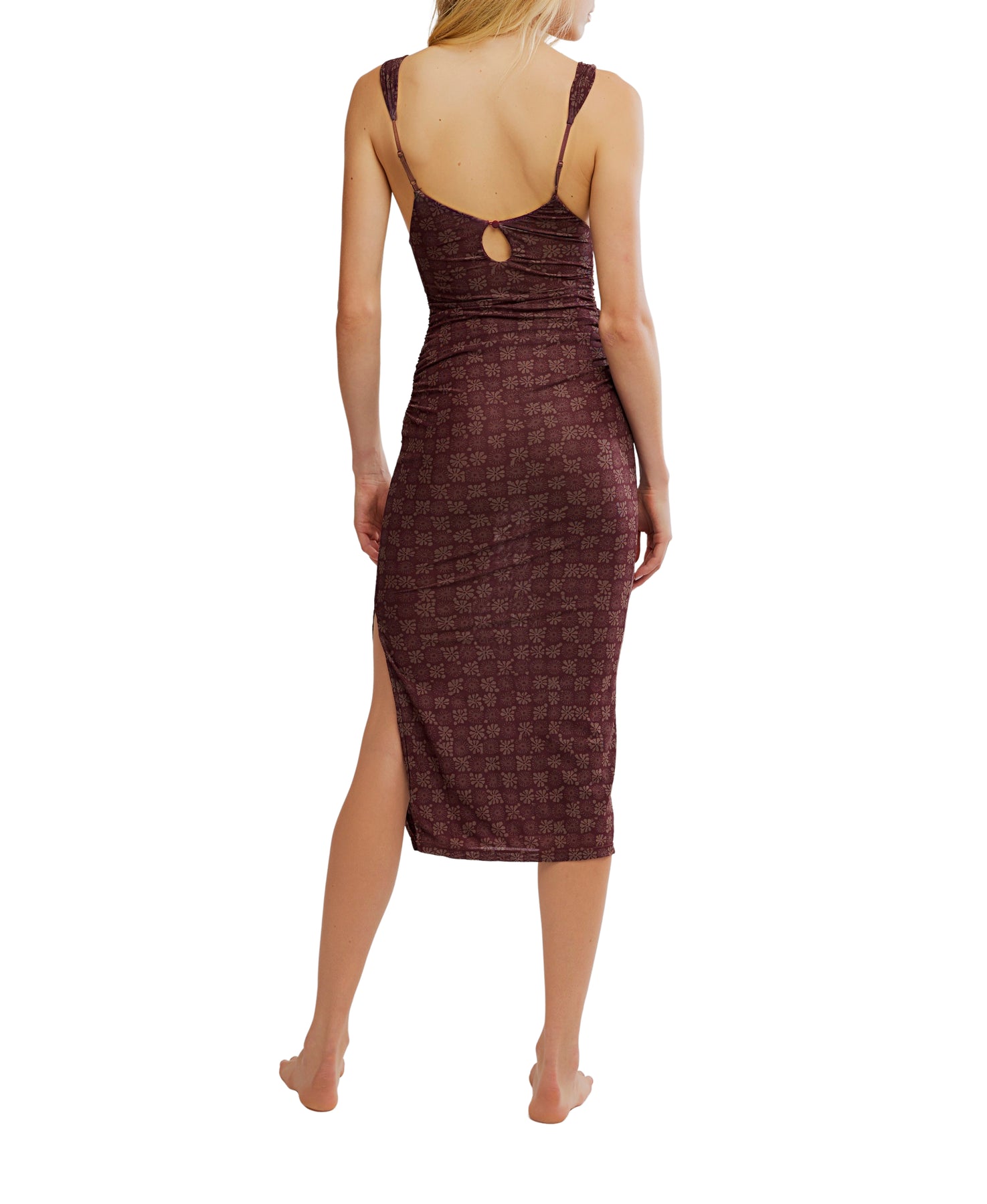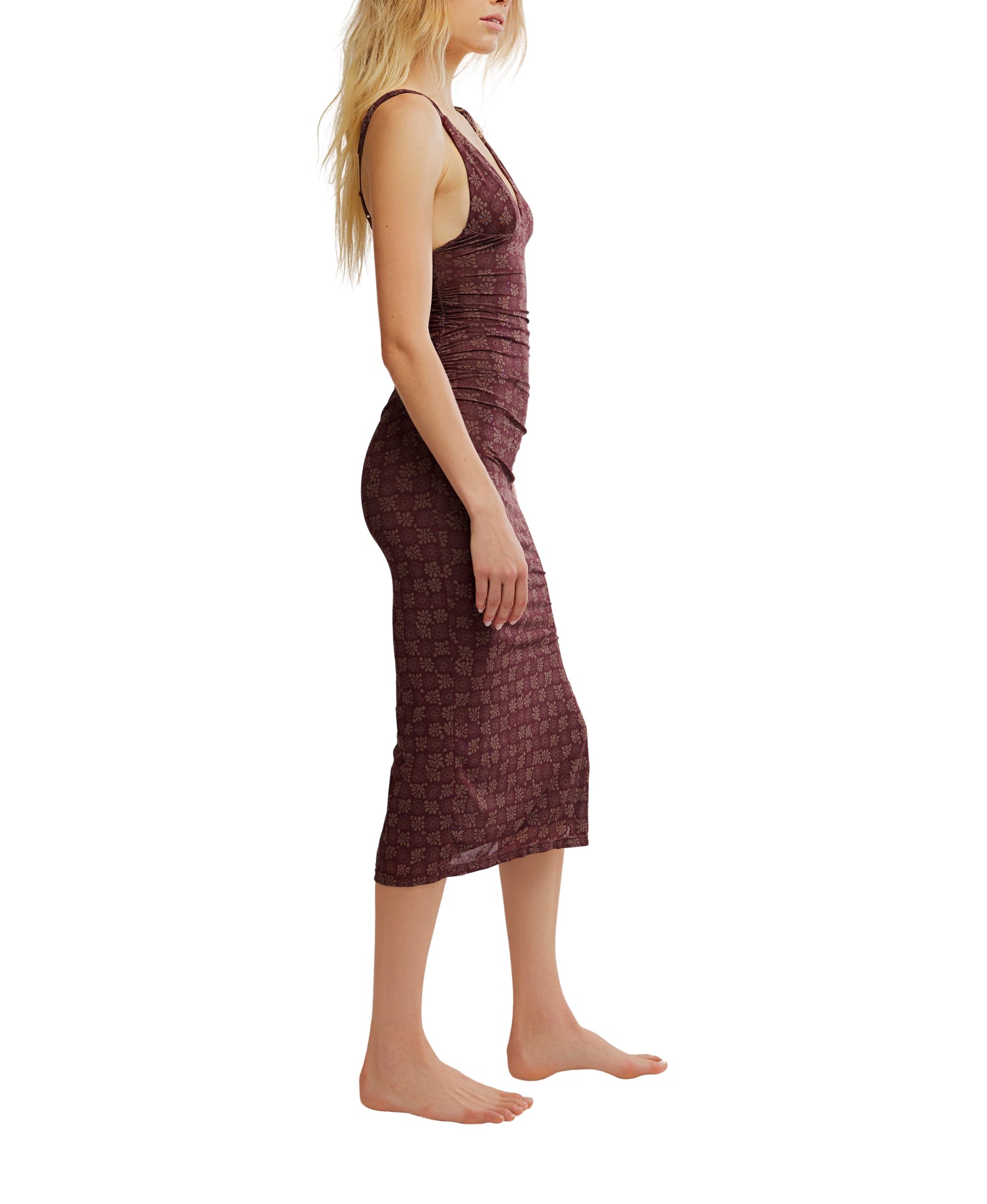 Turn heads in the Long Live Printed Mesh Dress in Brown by Free People. This form-fitting midi slip dress features ruched printed mesh fabric, a V-neckline, adjustable shoulder straps, and a side slit for a flattering, feminine silhouette. Finished with a back button closure, it’s a romantic wardrobe essential.