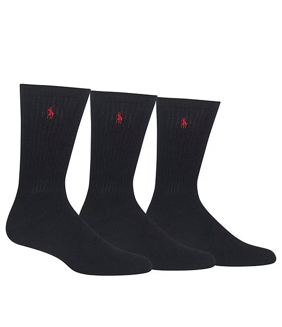 The Classic Sport 3-Pack in Black by Polo Ralph Lauren delivers everyday performance with a clean, athletic look. These crew socks feature ribbing from ankle to cuff for a secure fit and are finished with the signature embroidered Polo Pony. Made for lasting softness and comfort, this versatile black set is perfect for both active and casual wear.