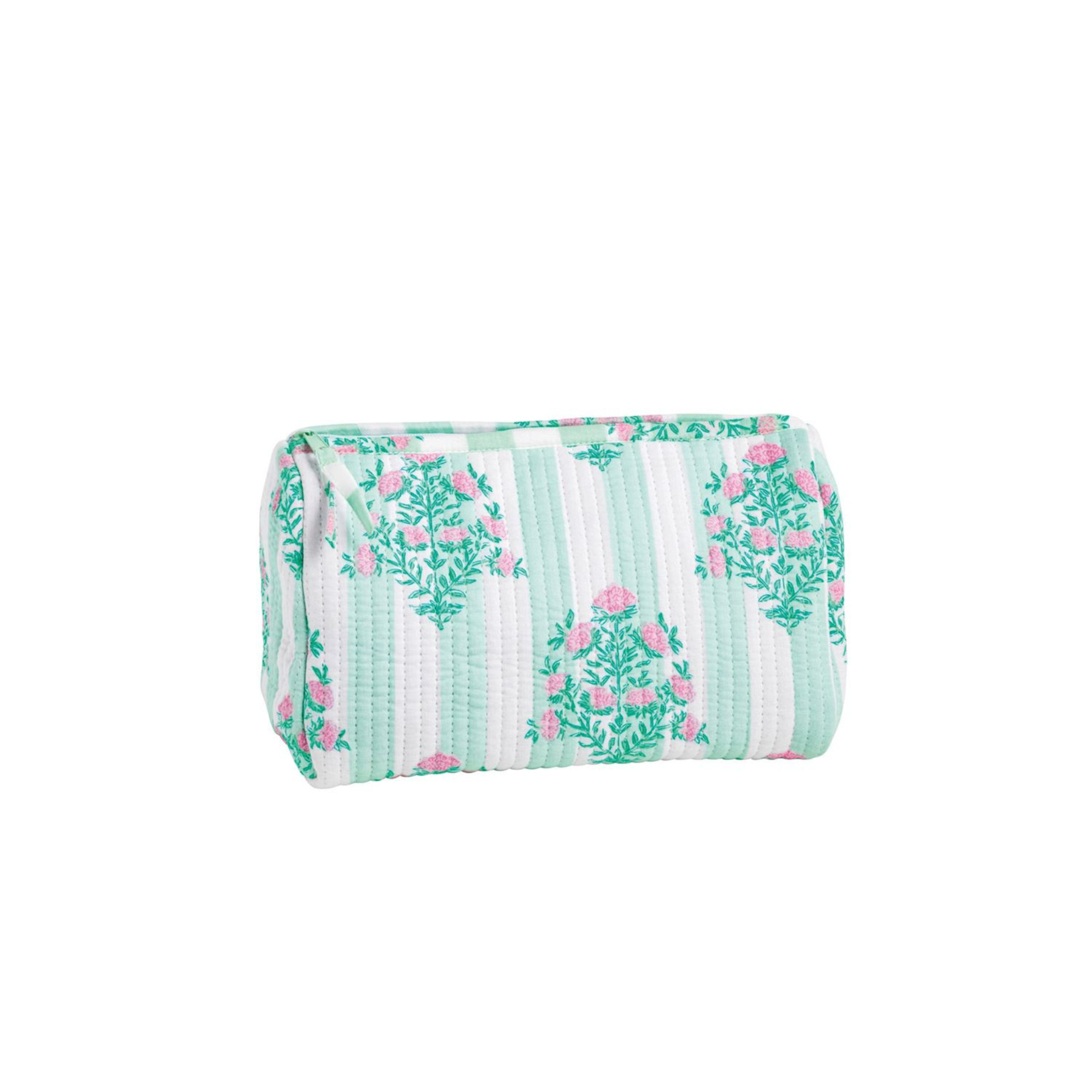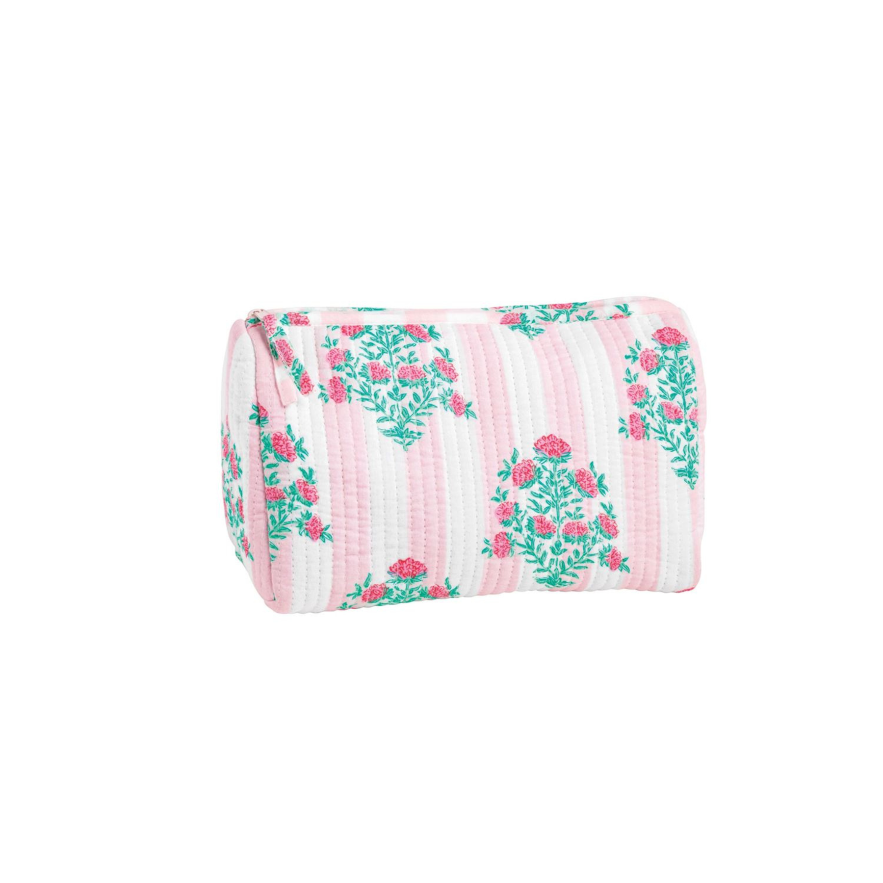 The Dahlia Block Print Case is a charming quilted cotton carry-all that combines style and functionality. Featuring a vibrant block print design, a contrast stripe lining, and a secure zipper closure, this case is perfect for organizing travel essentials, makeup, or everyday items in a stylish and practical way.